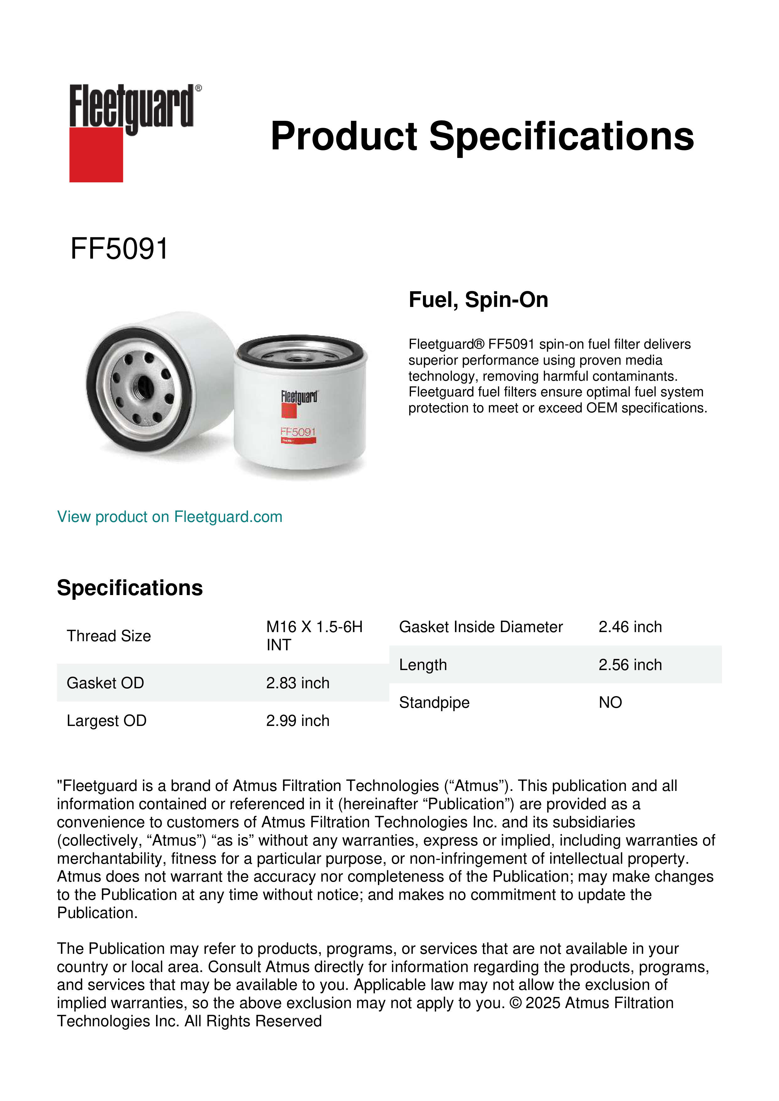 Fleetguard® FF5091 spin-on fuel filter delivers superior performance using proven media technology, removing harmful contaminants. Fleetguard fuel filters ensure optimal fuel system protection to meet or exceed OEM specifications.Specification