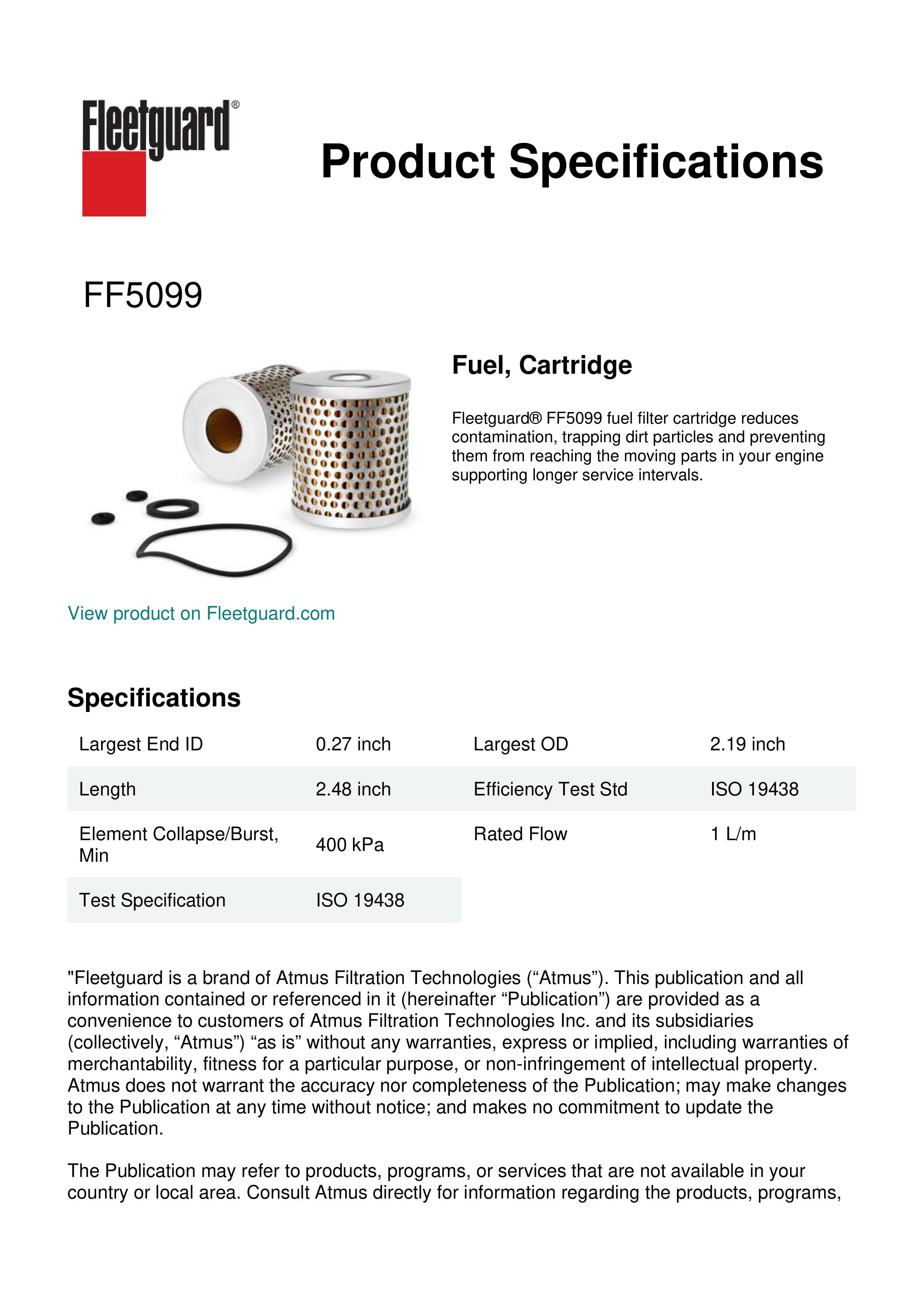 Fleetguard® FF5099 fuel filter cartridge reduces contamination, trapping dirt particles and preventing them from reaching the moving parts in your engine supporting longer service intervals.Specification