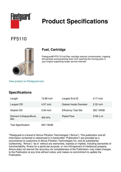 Fleetguard® FF5110 fuel filter cartridge reduces contamination, trapping dirt particles and preventing them from reaching the moving parts in your engine supporting longer service intervals.Specification