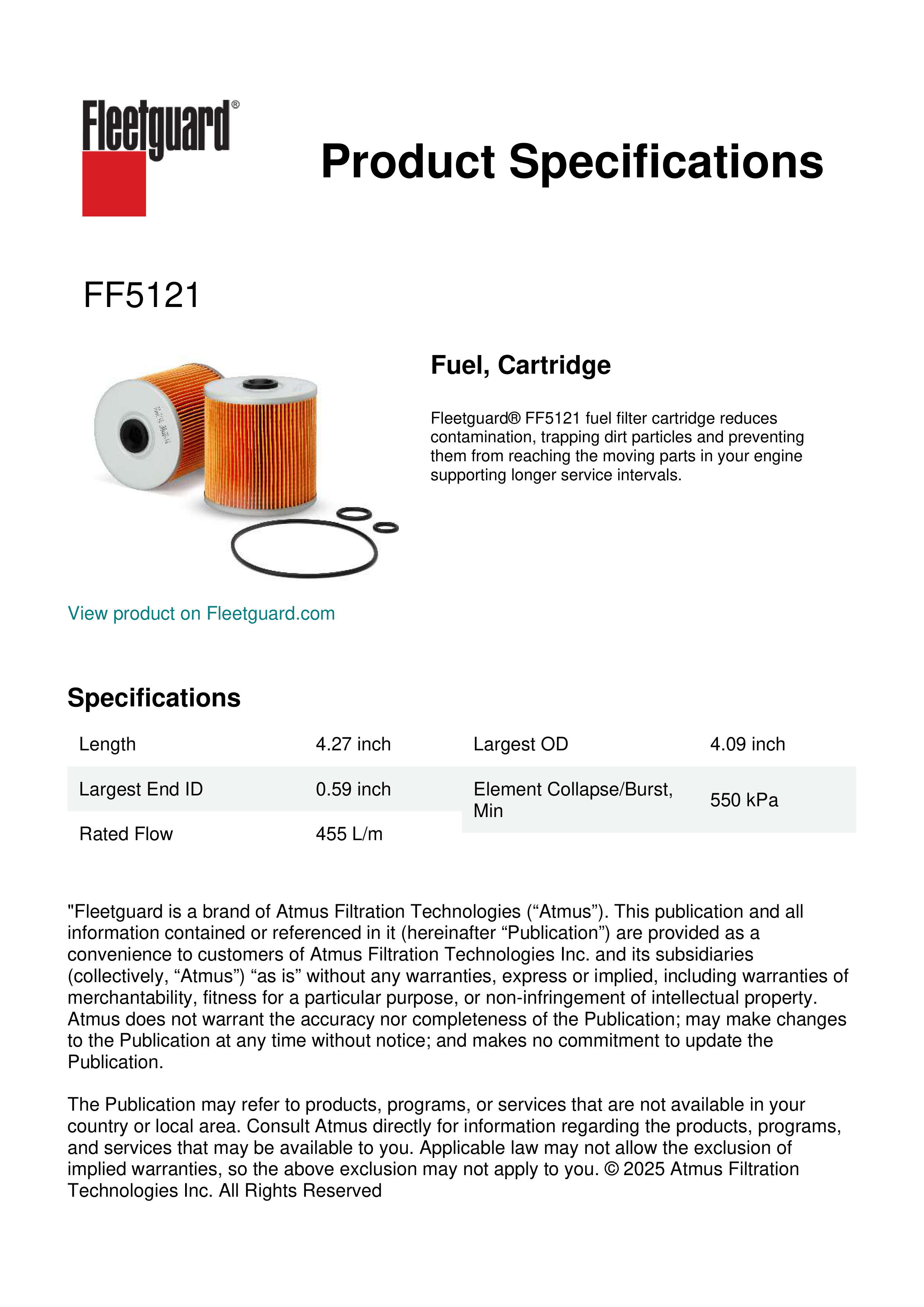 Fleetguard® FF5121 fuel filter cartridge reduces contamination, trapping dirt particles and preventing them from reaching the moving parts in your engine supporting longer service intervals.Specification