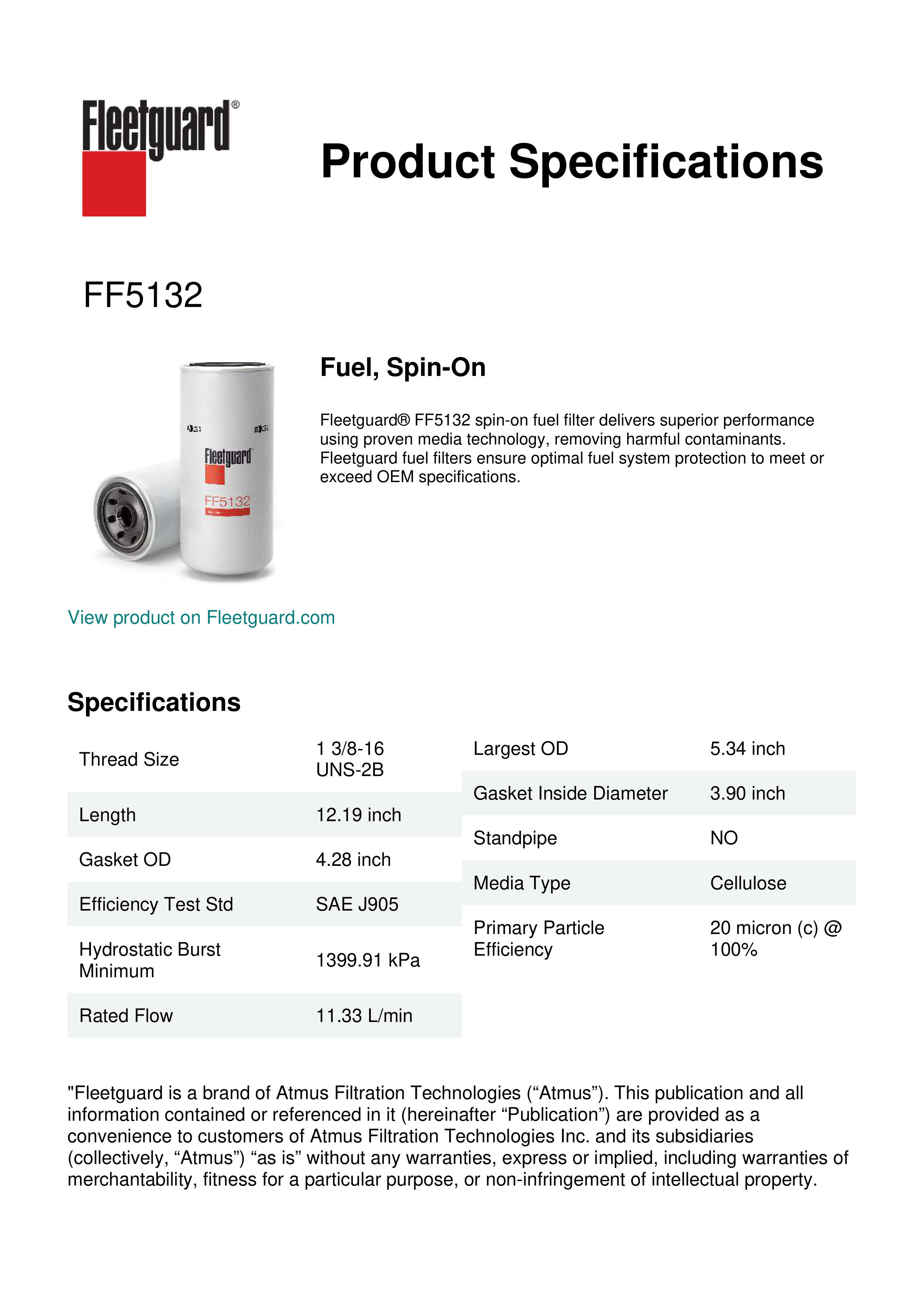 Fleetguard® FF5132 spin-on fuel filter delivers superior performance using proven media technology, removing harmful contaminants. Fleetguard fuel filters ensure optimal fuel system protection to meet or exceed OEM specifications.Specification