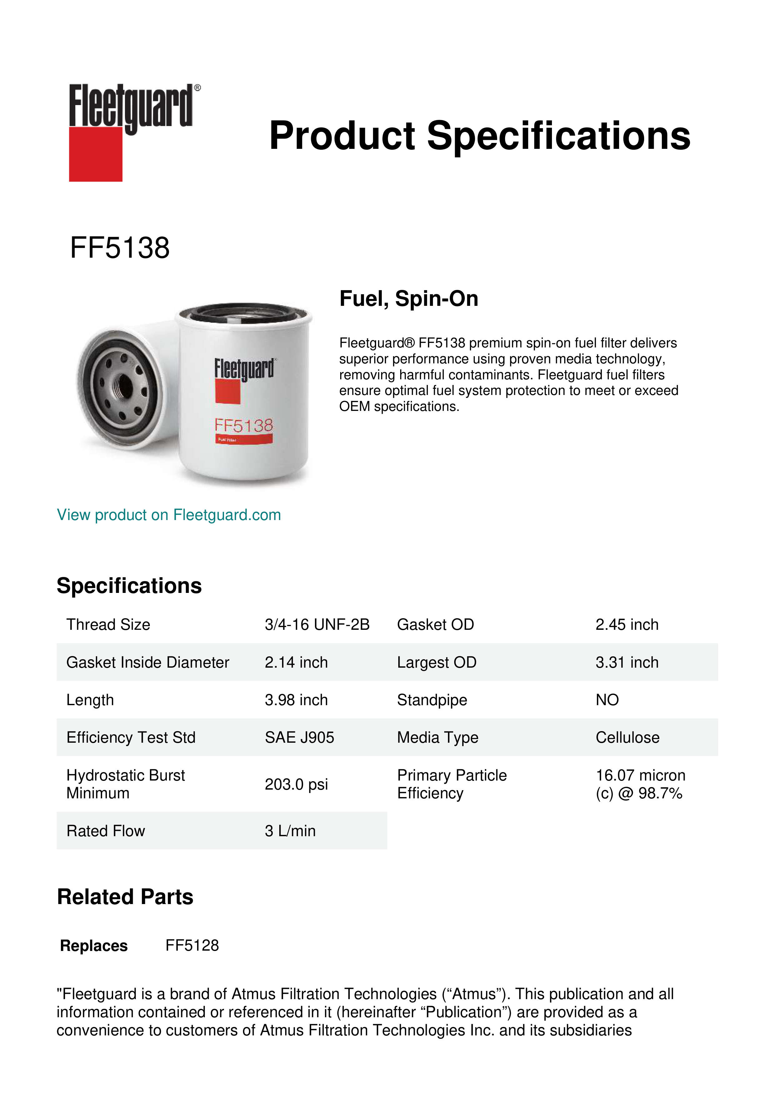Fleetguard® FF5138 premium spin-on fuel filter delivers superior performance using proven media technology, removing harmful contaminants. Fleetguard fuel filters ensure optimal fuel system protection to meet or exceed OEM specifications.Specification