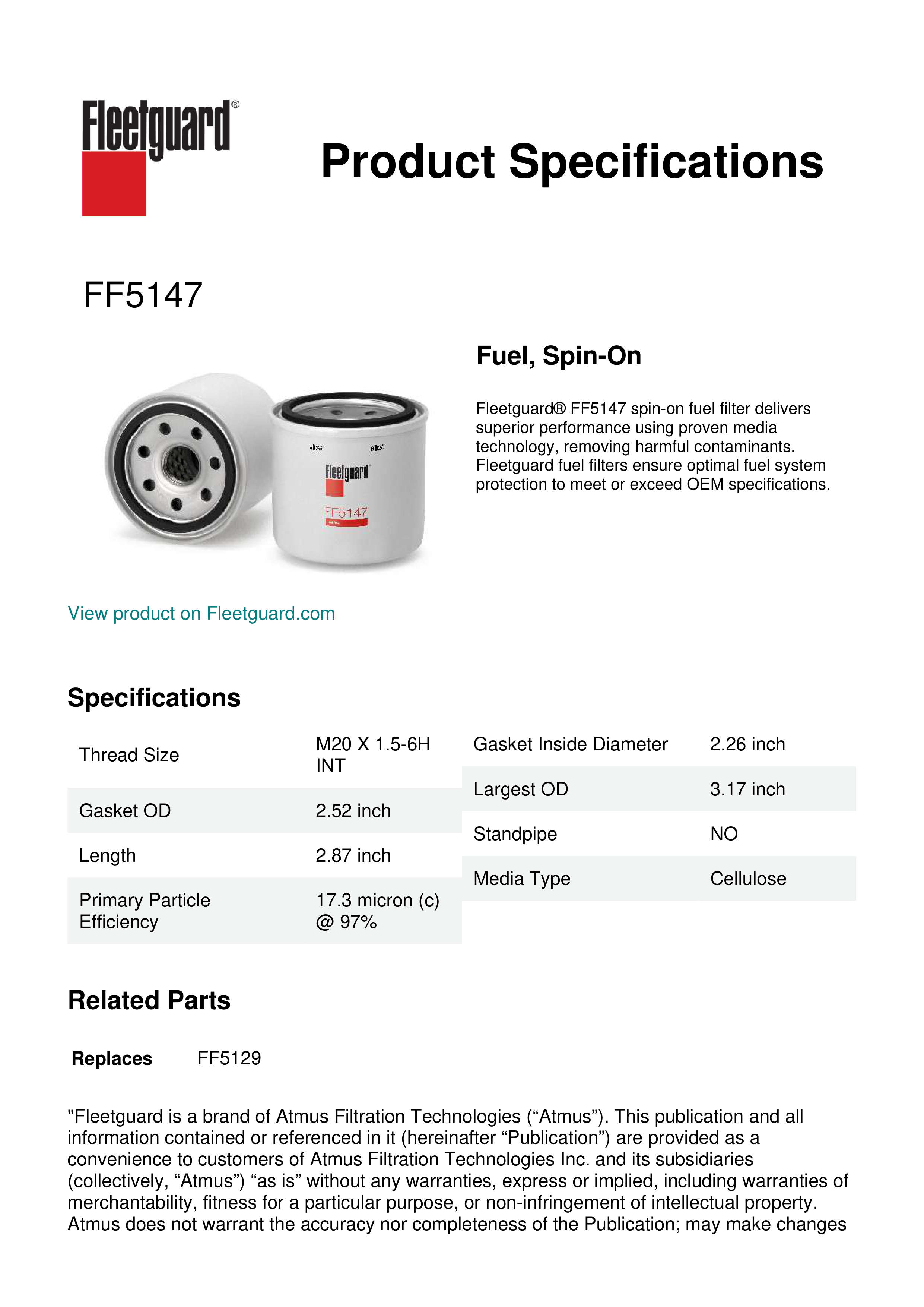 Fleetguard® FF5147 spin-on fuel filter delivers superior performance using proven media technology, removing harmful contaminants. Fleetguard fuel filters ensure optimal fuel system protection to meet or exceed OEM specifications.Specification