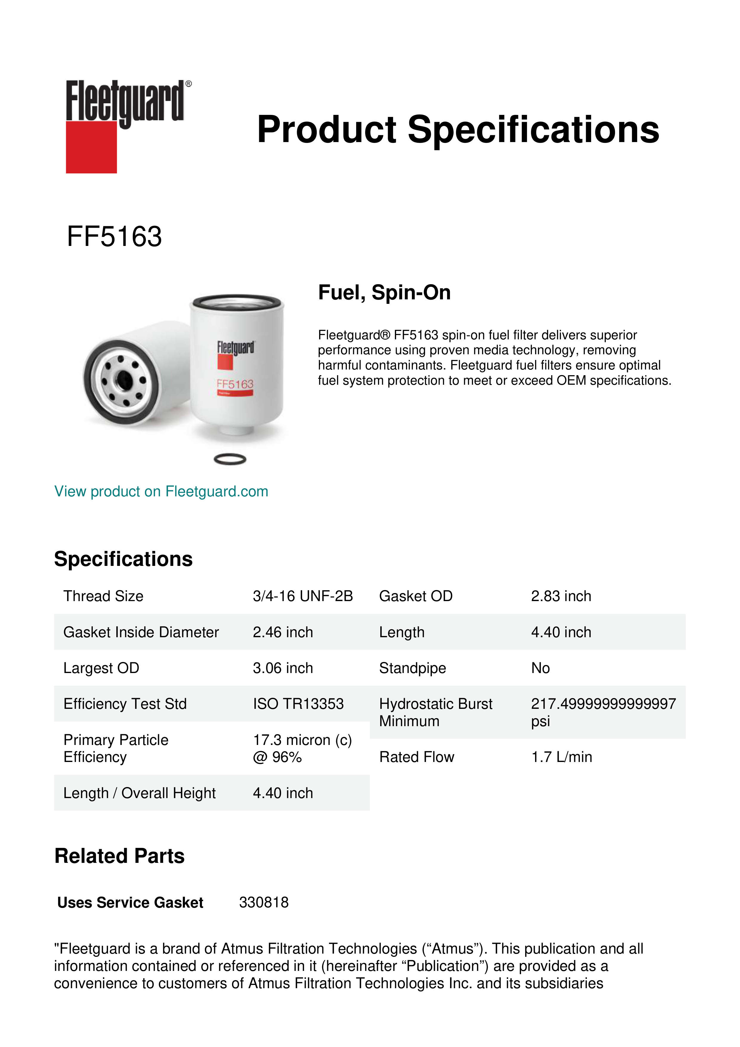 Fleetguard® FF5163 spin-on fuel filter delivers superior performance using proven media technology, removing harmful contaminants. Fleetguard fuel filters ensure optimal fuel system protection to meet or exceed OEM specifications.Specification