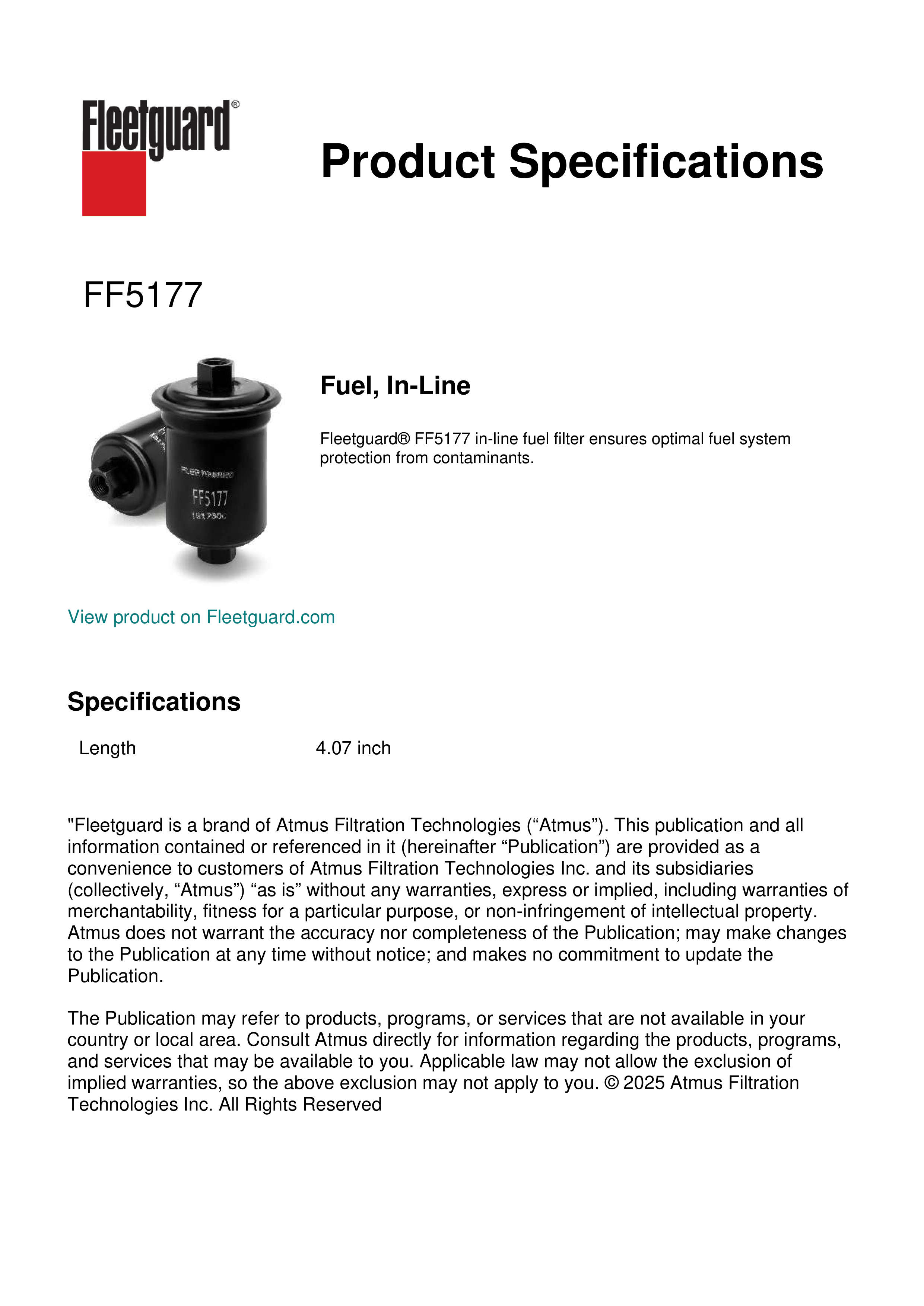 Fleetguard® FF5177 in-line fuel filter ensures optimal fuel system protection from contaminants.Specification