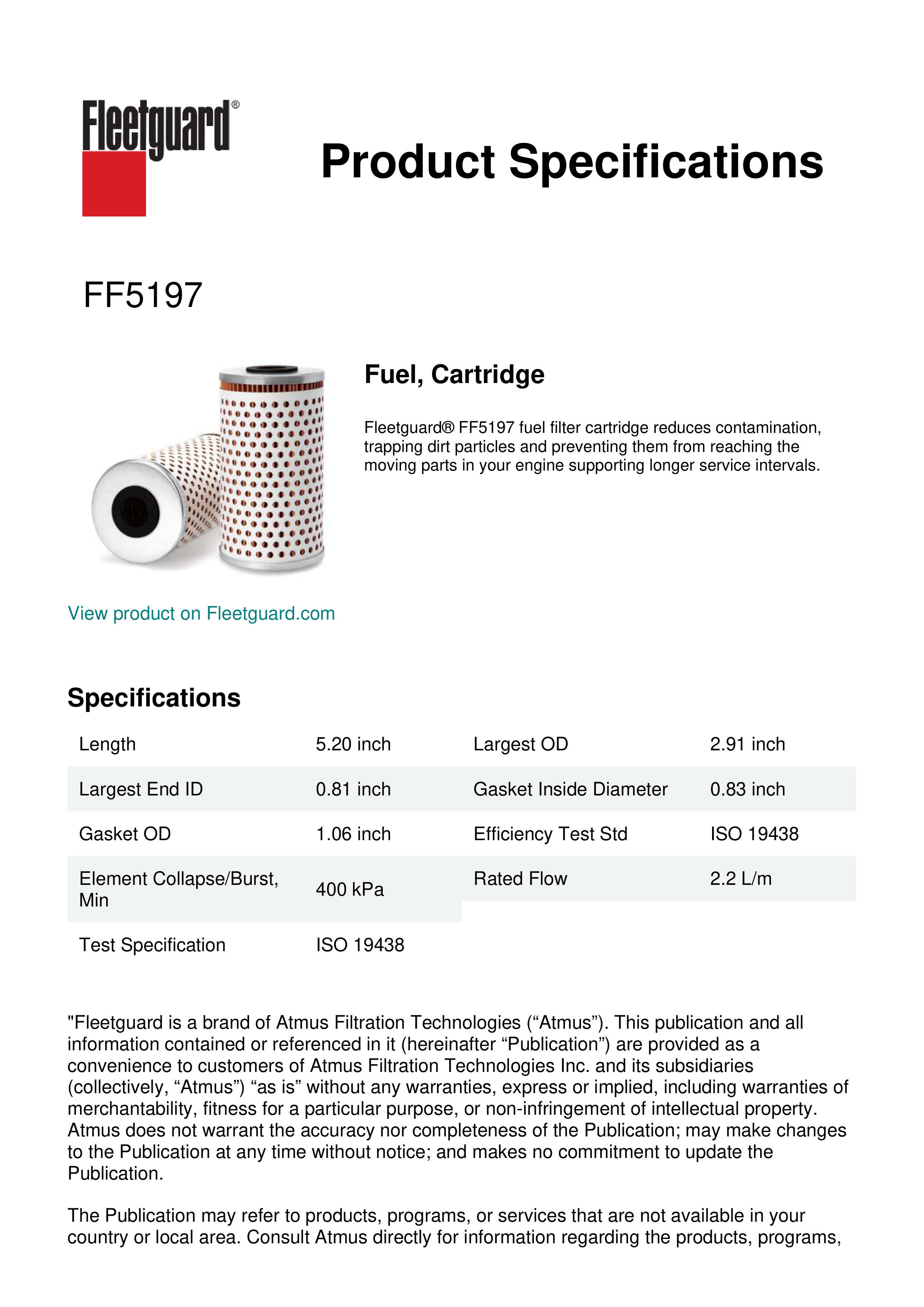 Fleetguard® FF5197 fuel filter cartridge reduces contamination, trapping dirt particles and preventing them from reaching the moving parts in your engine supporting longer service intervals.Specification
