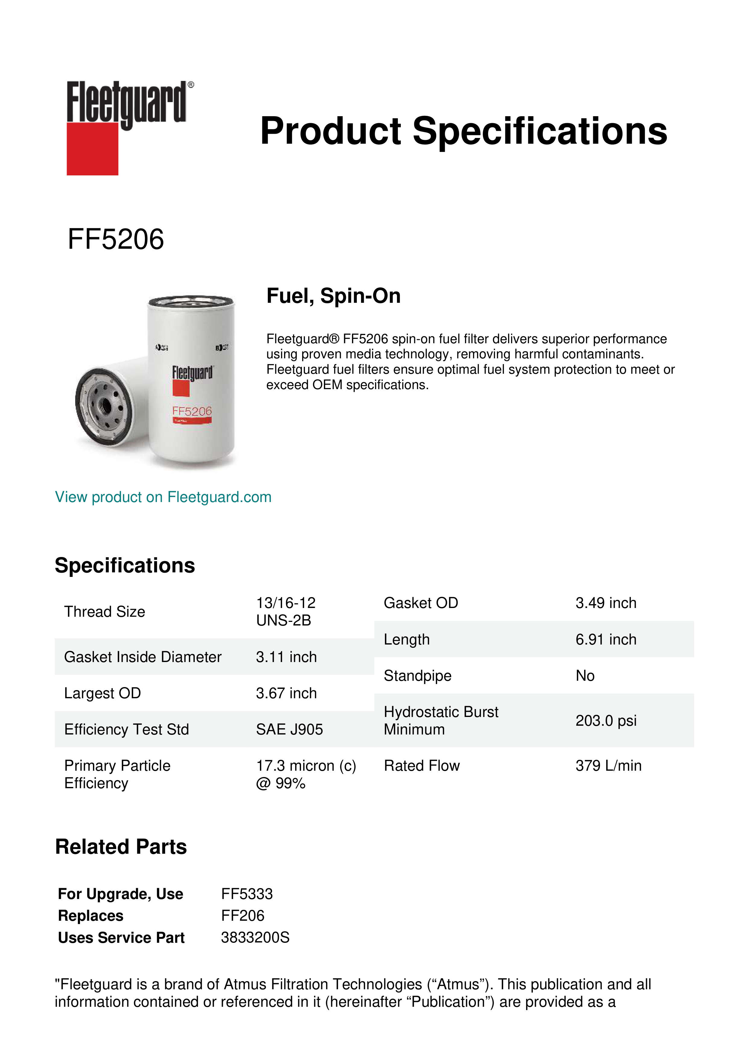 Fleetguard® FF5206 spin-on fuel filter delivers superior performance using proven media technology, removing harmful contaminants. Fleetguard fuel filters ensure optimal fuel system protection to meet or exceed OEM specifications.Specification