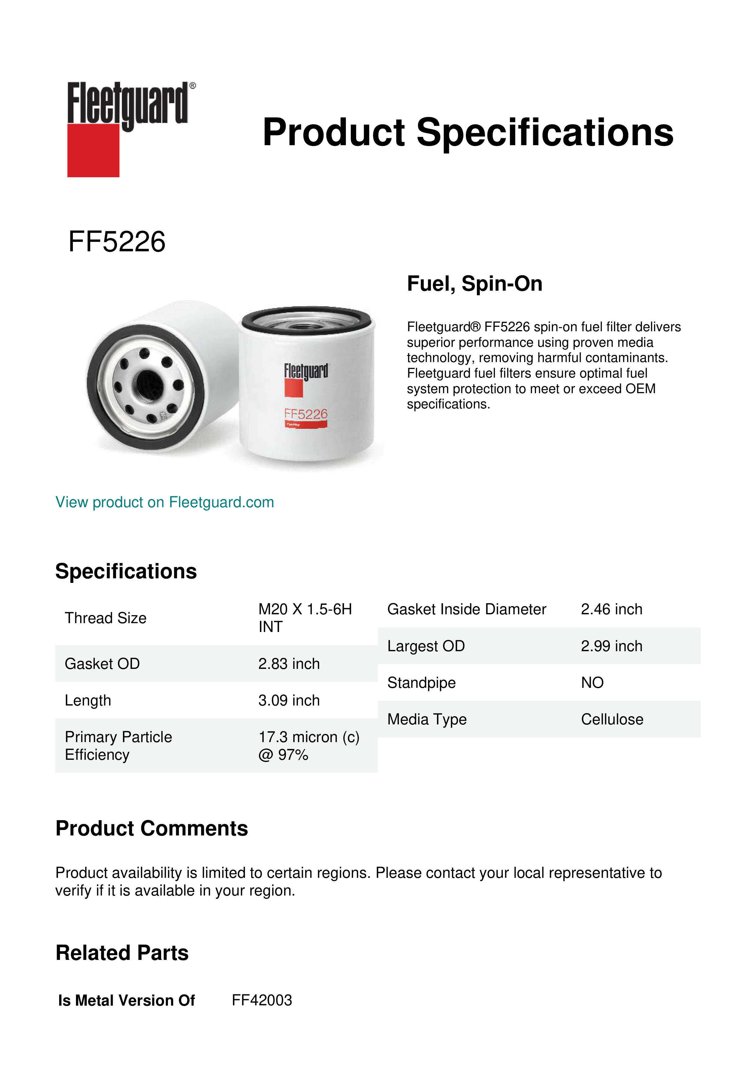 Fleetguard® FF5226 spin-on fuel filter delivers superior performance using proven media technology, removing harmful contaminants. Fleetguard fuel filters ensure optimal fuel system protection to meet or exceed OEM specifications.Specification