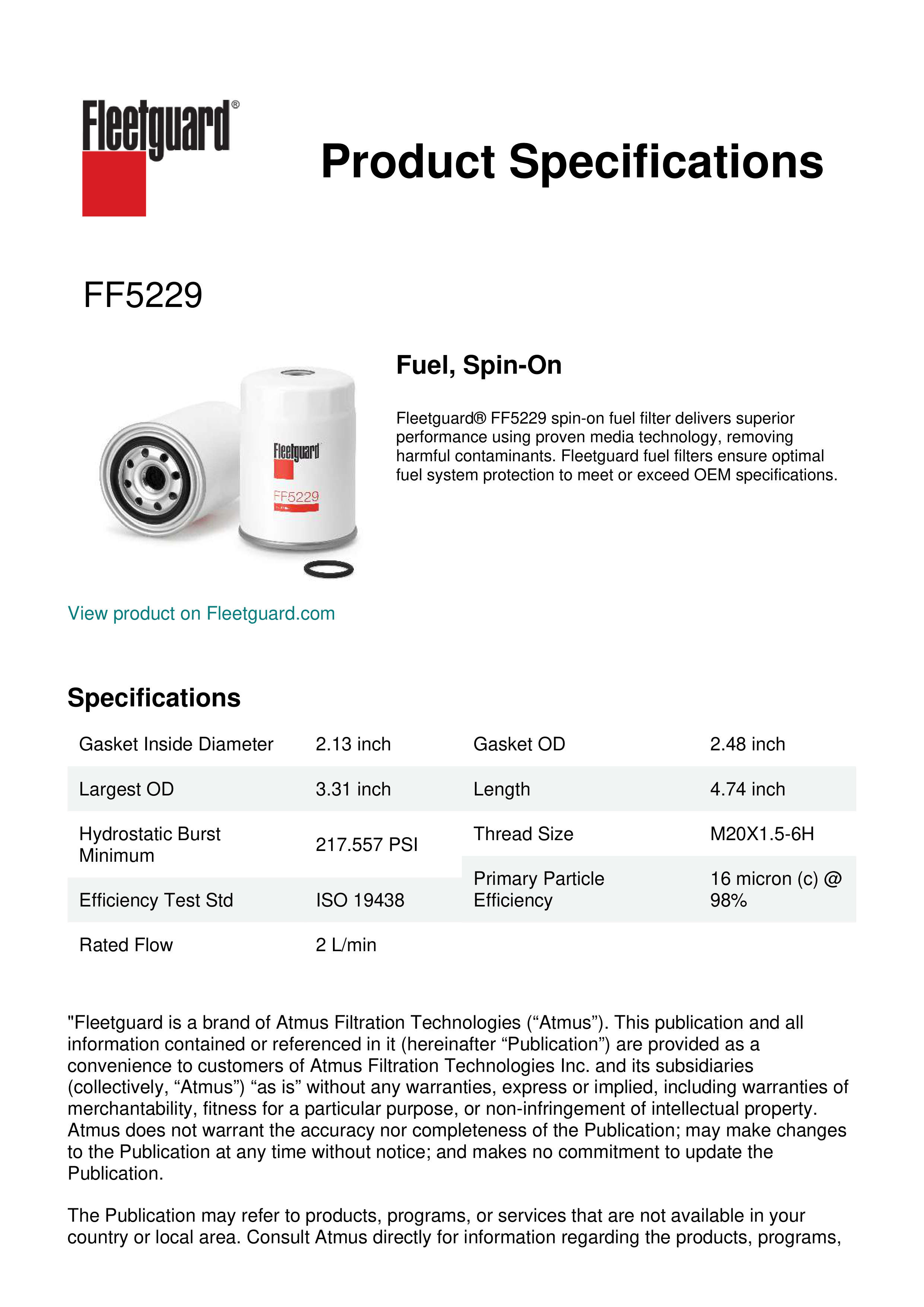 Fleetguard® FF5229 spin-on fuel filter delivers superior performance using proven media technology, removing harmful contaminants. Fleetguard fuel filters ensure optimal fuel system protection to meet or exceed OEM specifications.Specification