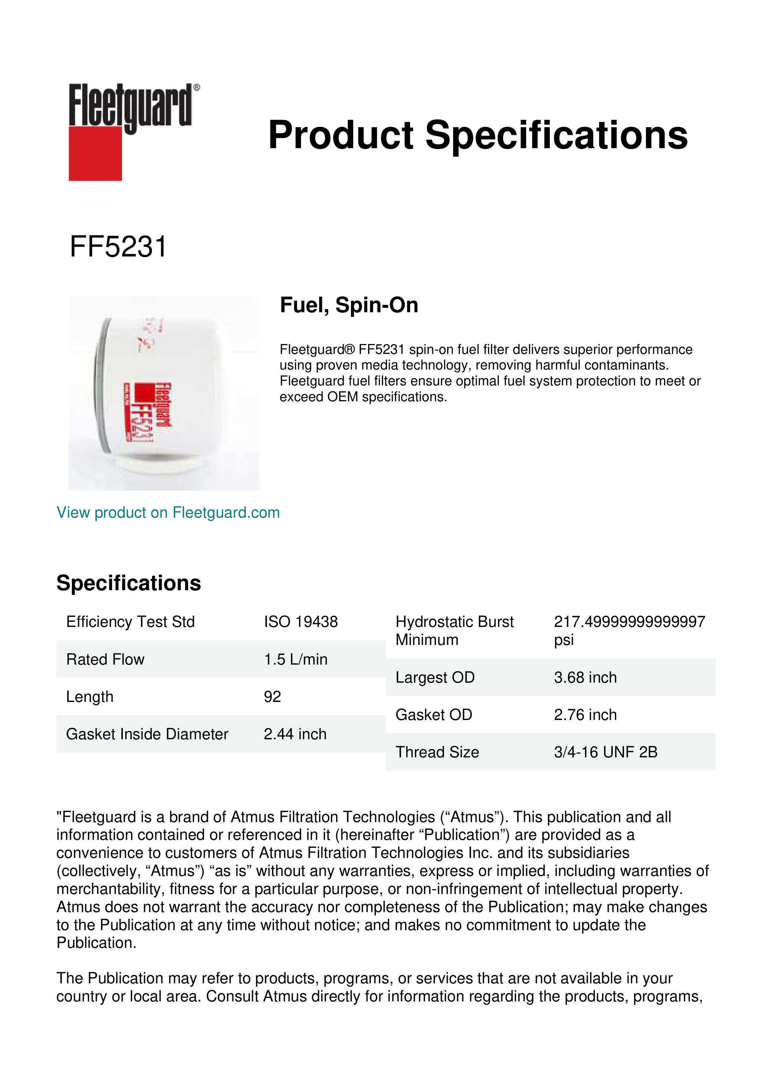 Fleetguard® FF5231 spin-on fuel filter delivers superior performance using proven media technology, removing harmful contaminants. Fleetguard fuel filters ensure optimal fuel system protection to meet or exceed OEM specifications.Specification