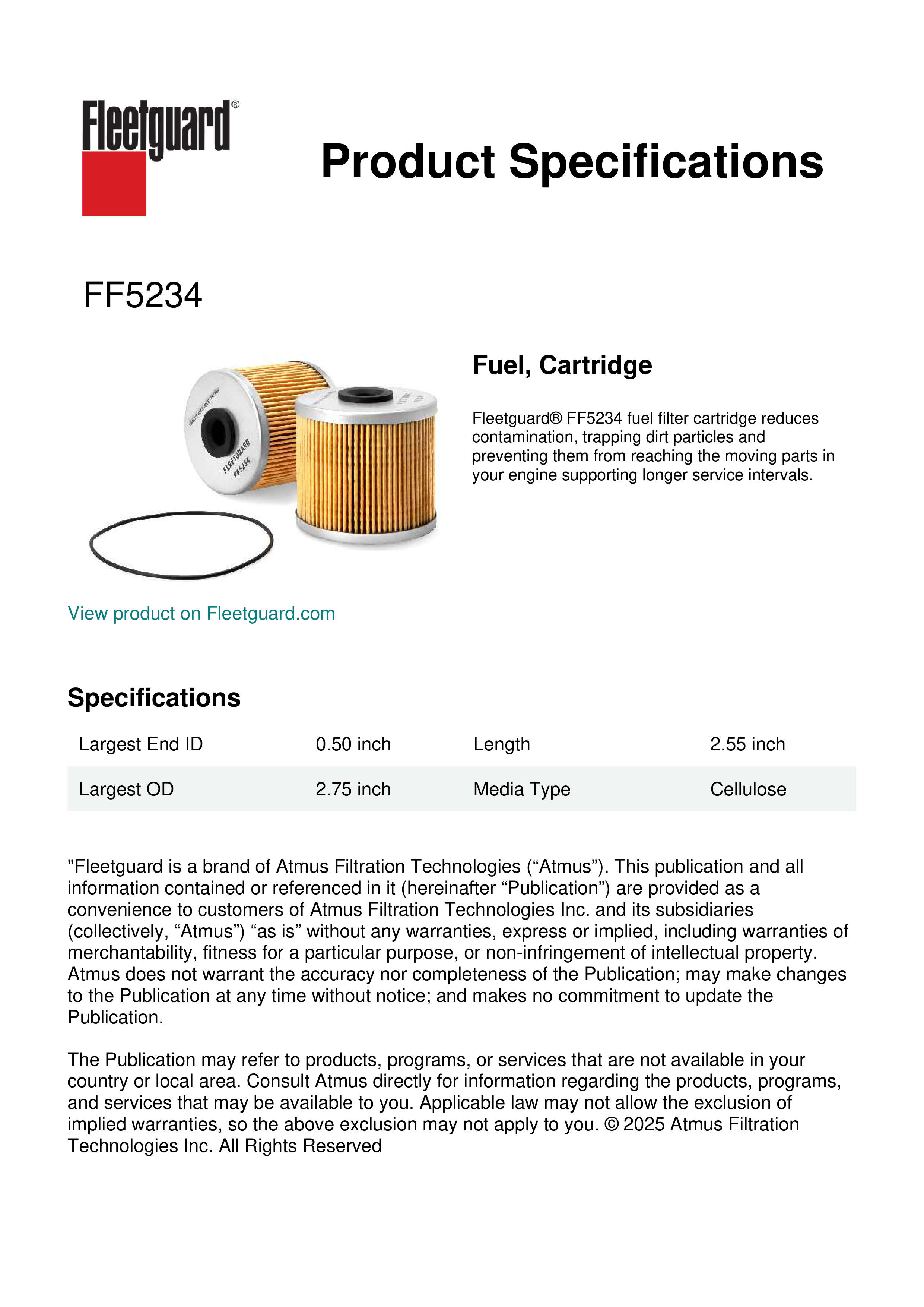 Fleetguard® FF5234 fuel filter cartridge reduces contamination, trapping dirt particles and preventing them from reaching the moving parts in your engine supporting longer service intervals.Specification