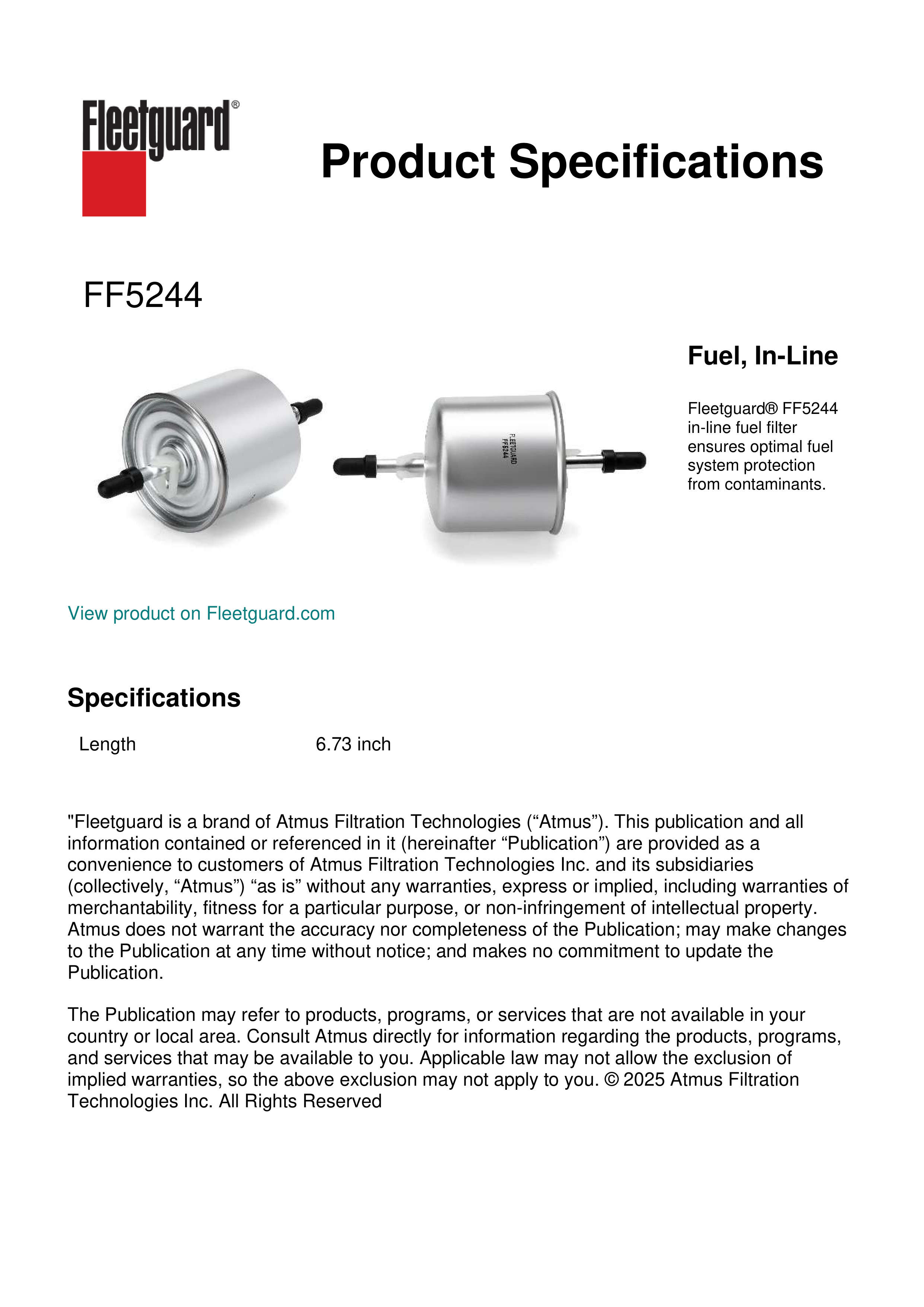Fleetguard® FF5244 in-line fuel filter ensures optimal fuel system protection from contaminants.Specification