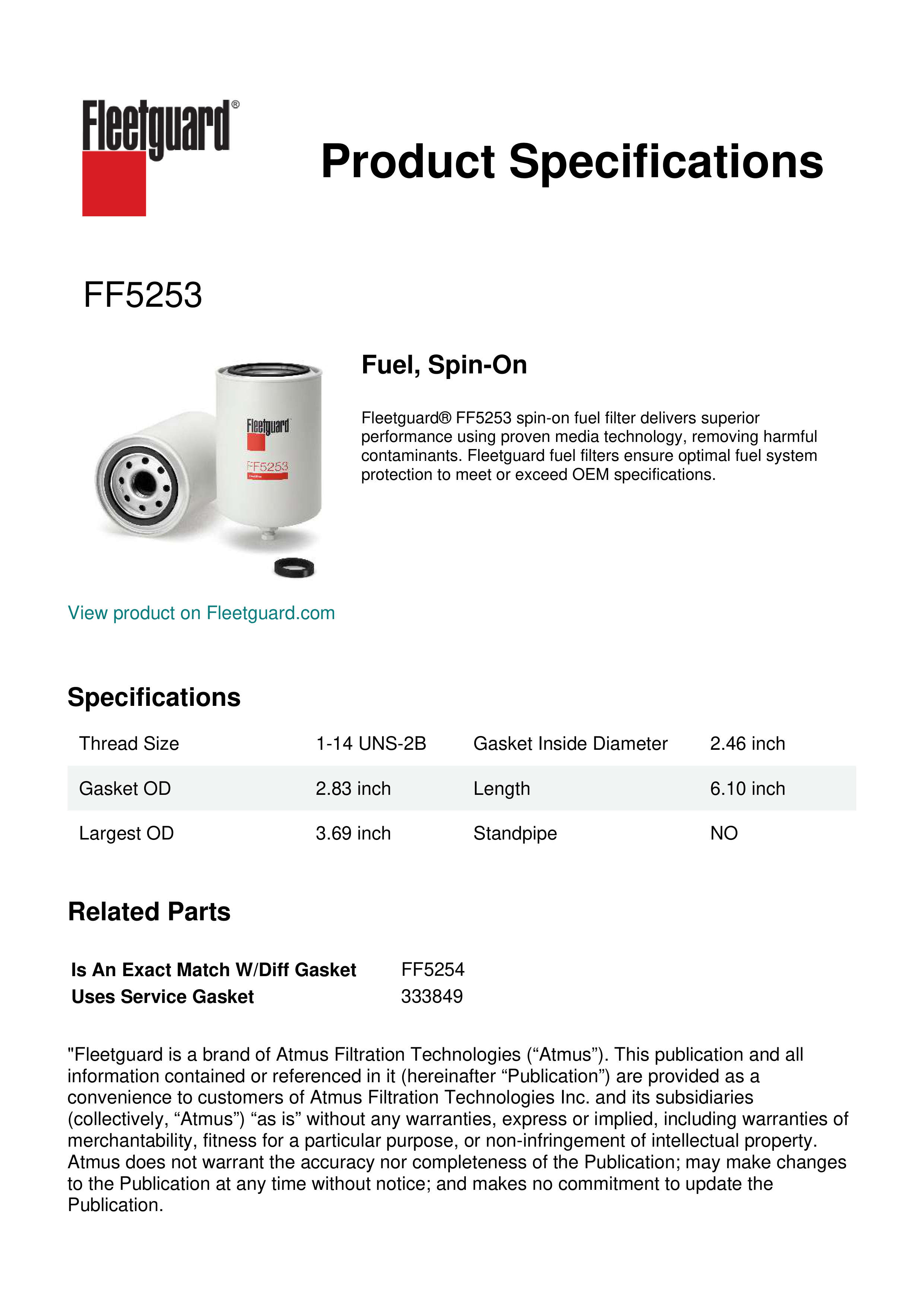 Fleetguard® FF5253 spin-on fuel filter delivers superior performance using proven media technology, removing harmful contaminants. Fleetguard fuel filters ensure optimal fuel system protection to meet or exceed OEM specifications.Specification