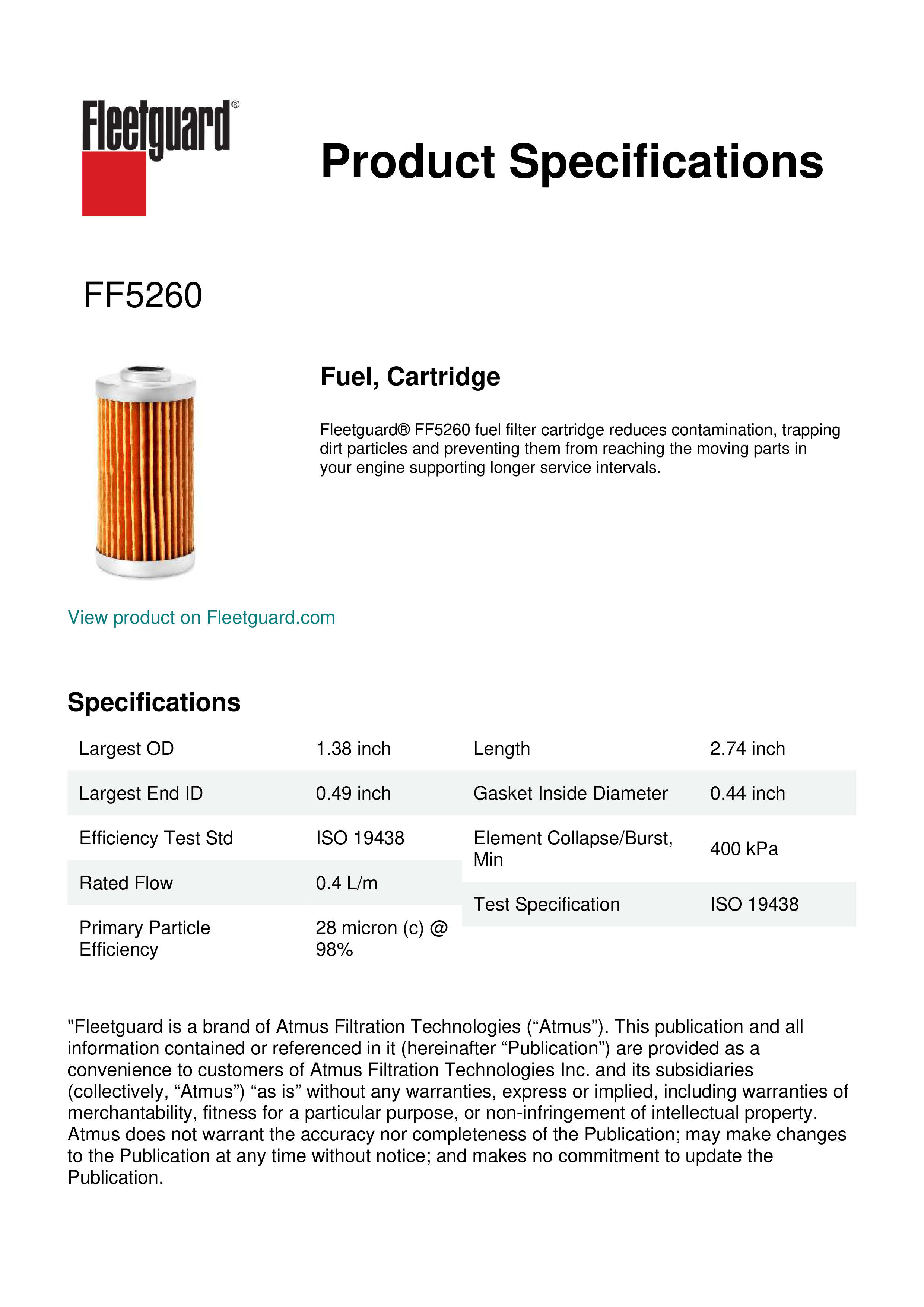 Fleetguard® FF5260 fuel filter cartridge reduces contamination, trapping dirt particles and preventing them from reaching the moving parts in your engine supporting longer service intervals.Specification