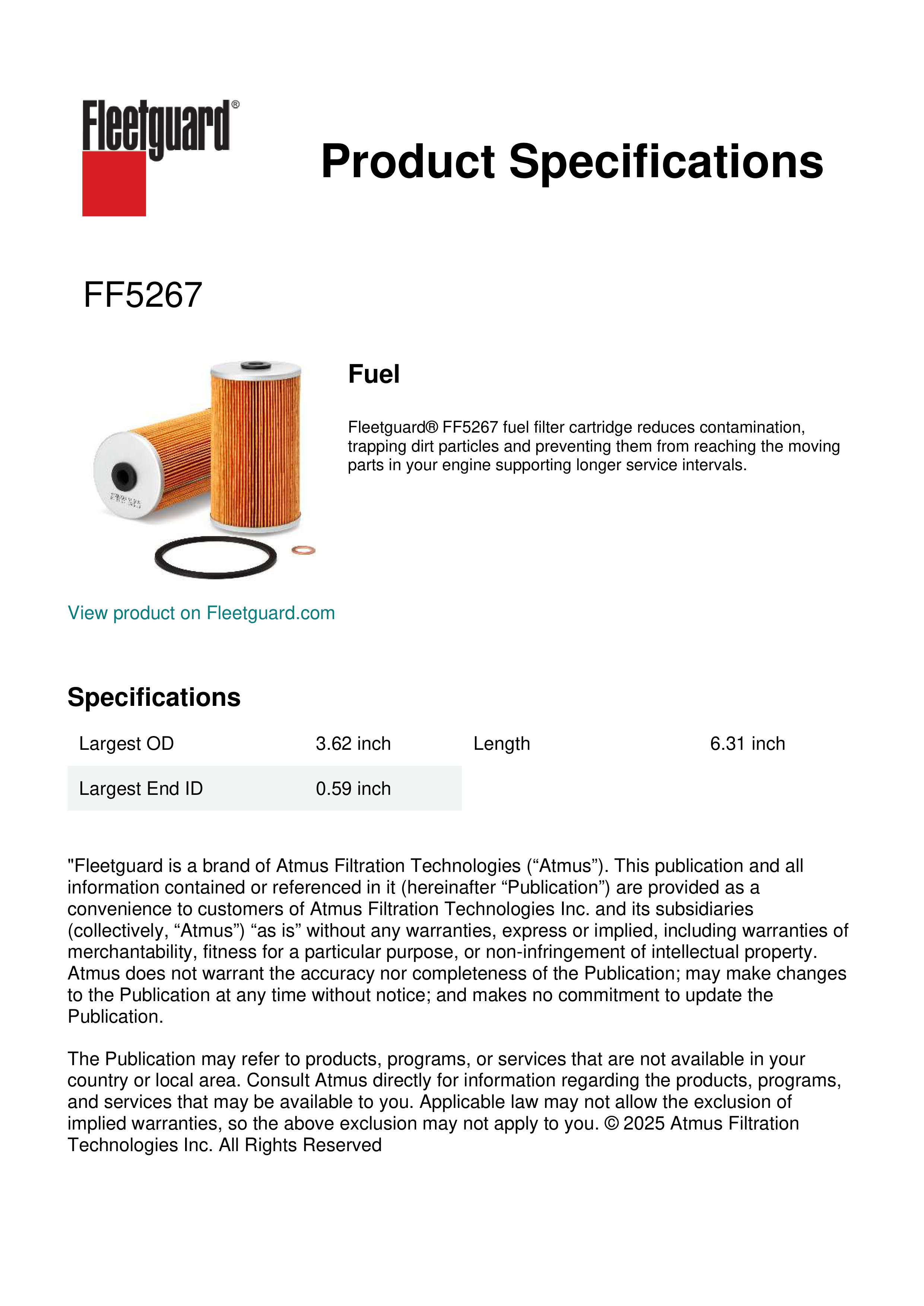 Fleetguard® FF5267 fuel filter cartridge reduces contamination, trapping dirt particles and preventing them from reaching the moving parts in your engine supporting longer service intervals.Specification