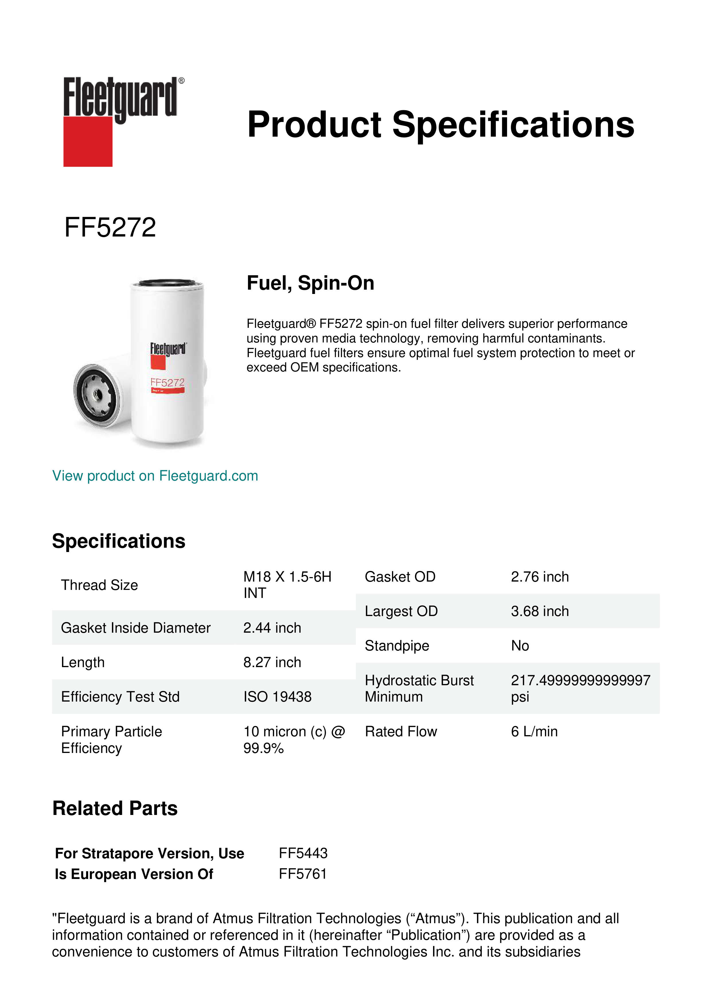 Fleetguard® FF5272 spin-on fuel filter delivers superior performance using proven media technology, removing harmful contaminants. Fleetguard fuel filters ensure optimal fuel system protection to meet or exceed OEM specifications.Specification
