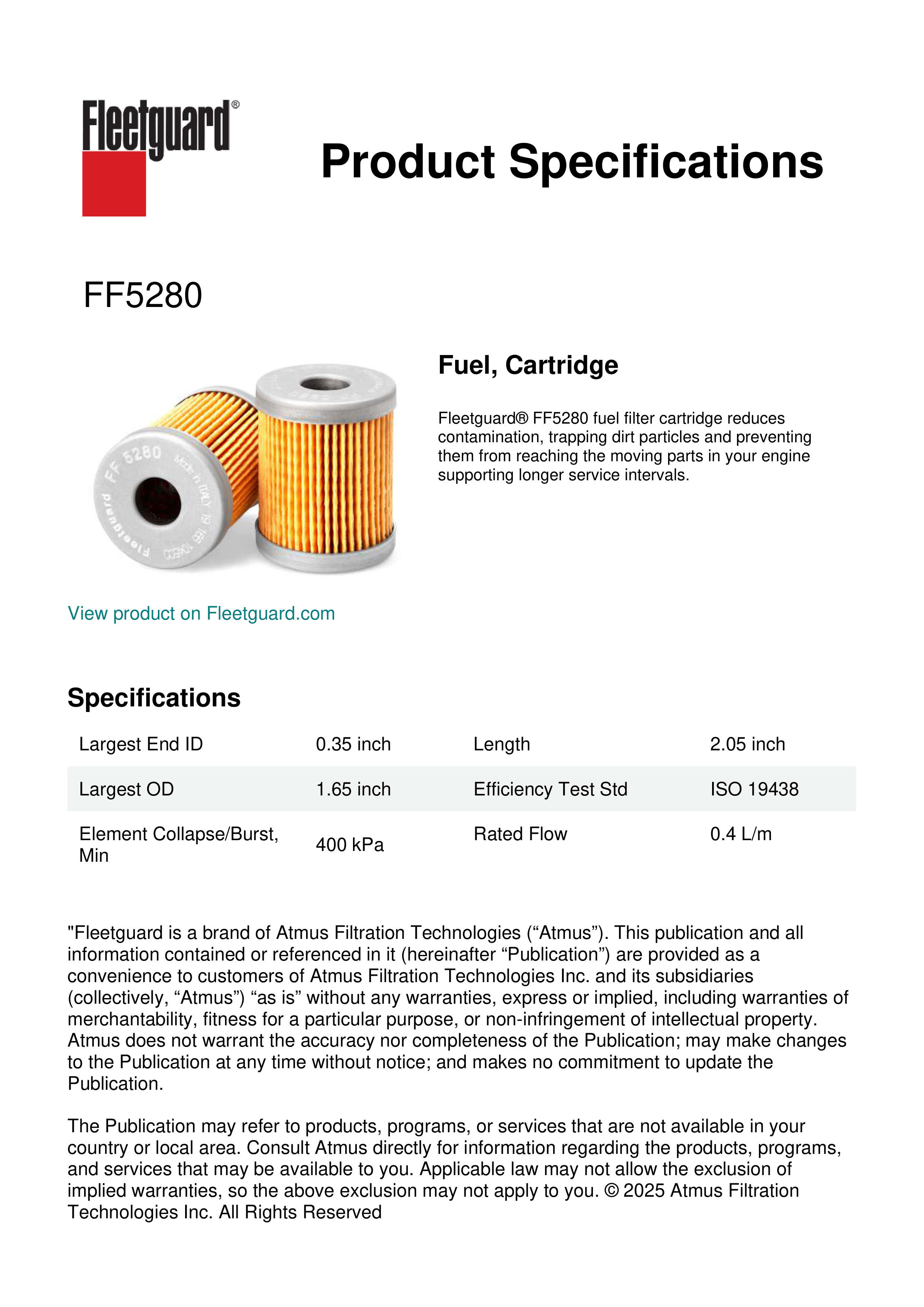 Fleetguard® FF5280 fuel filter cartridge reduces contamination, trapping dirt particles and preventing them from reaching the moving parts in your engine supporting longer service intervals.Specification