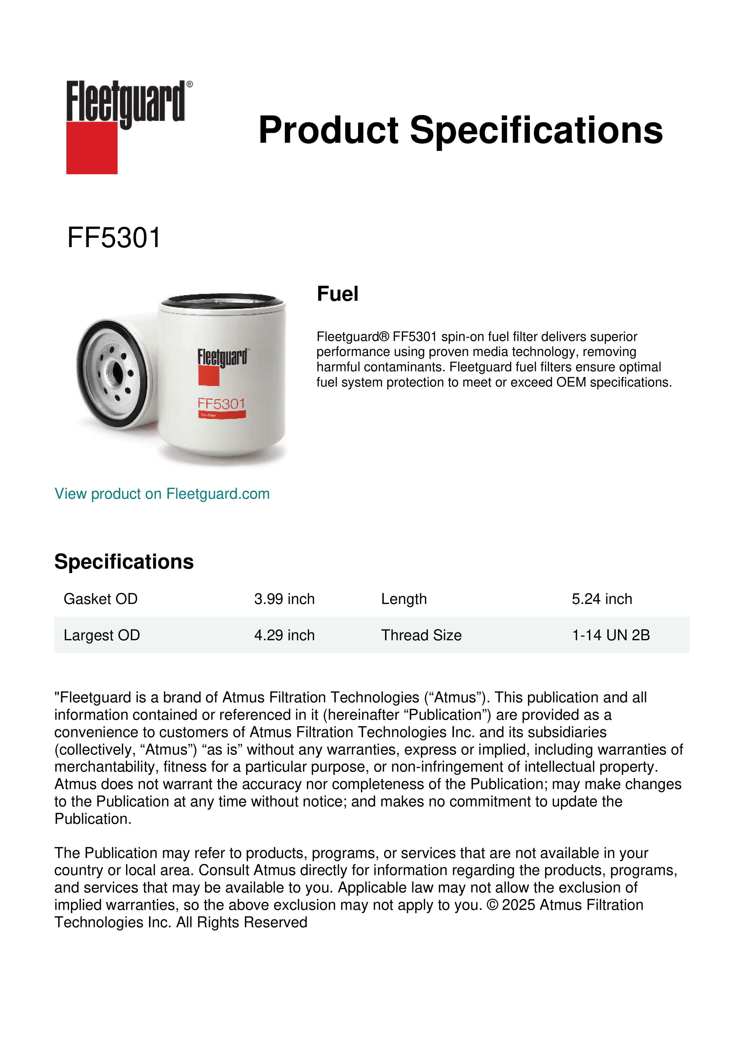 Fleetguard® FF5301 spin-on fuel filter delivers superior performance using proven media technology, removing harmful contaminants. Fleetguard fuel filters ensure optimal fuel system protection to meet or exceed OEM specifications.Specification