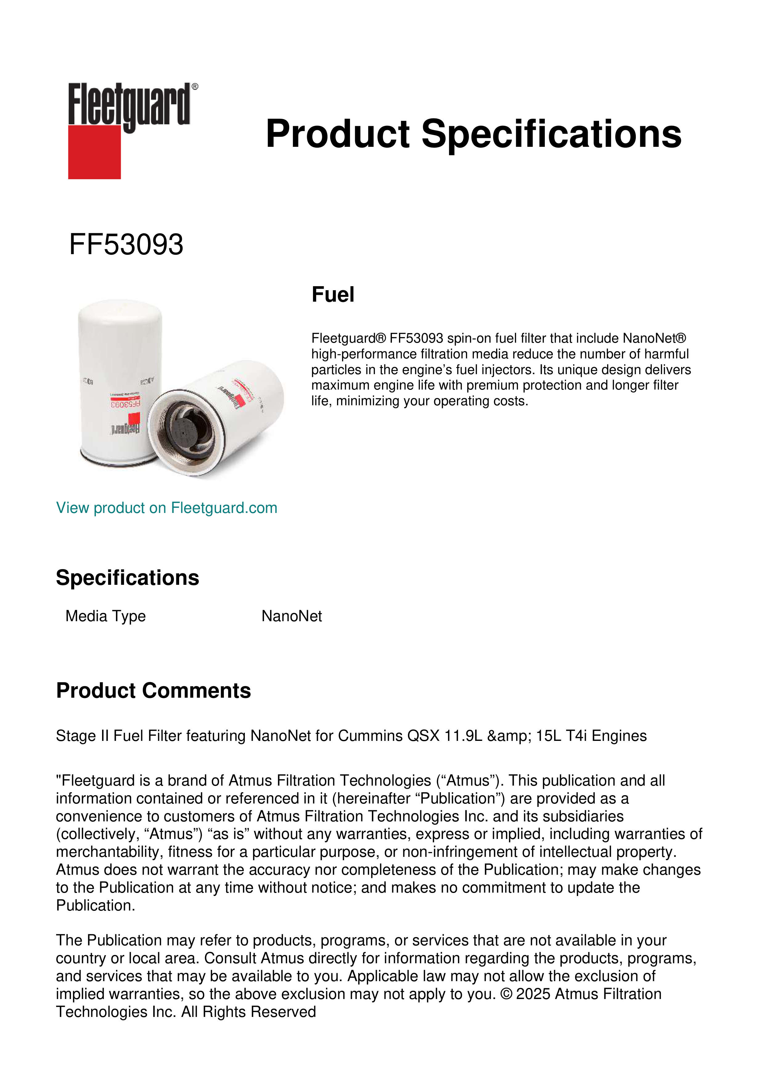 Fleetguard® FF53093 spin-on fuel filter that include NanoNet® high-performance filtration media reduce the number of harmful particles in the engine’s fuel injectors. Its unique design delivers maximum engine life with premium protection and longer filter life, minimizing your operating costs.Specification