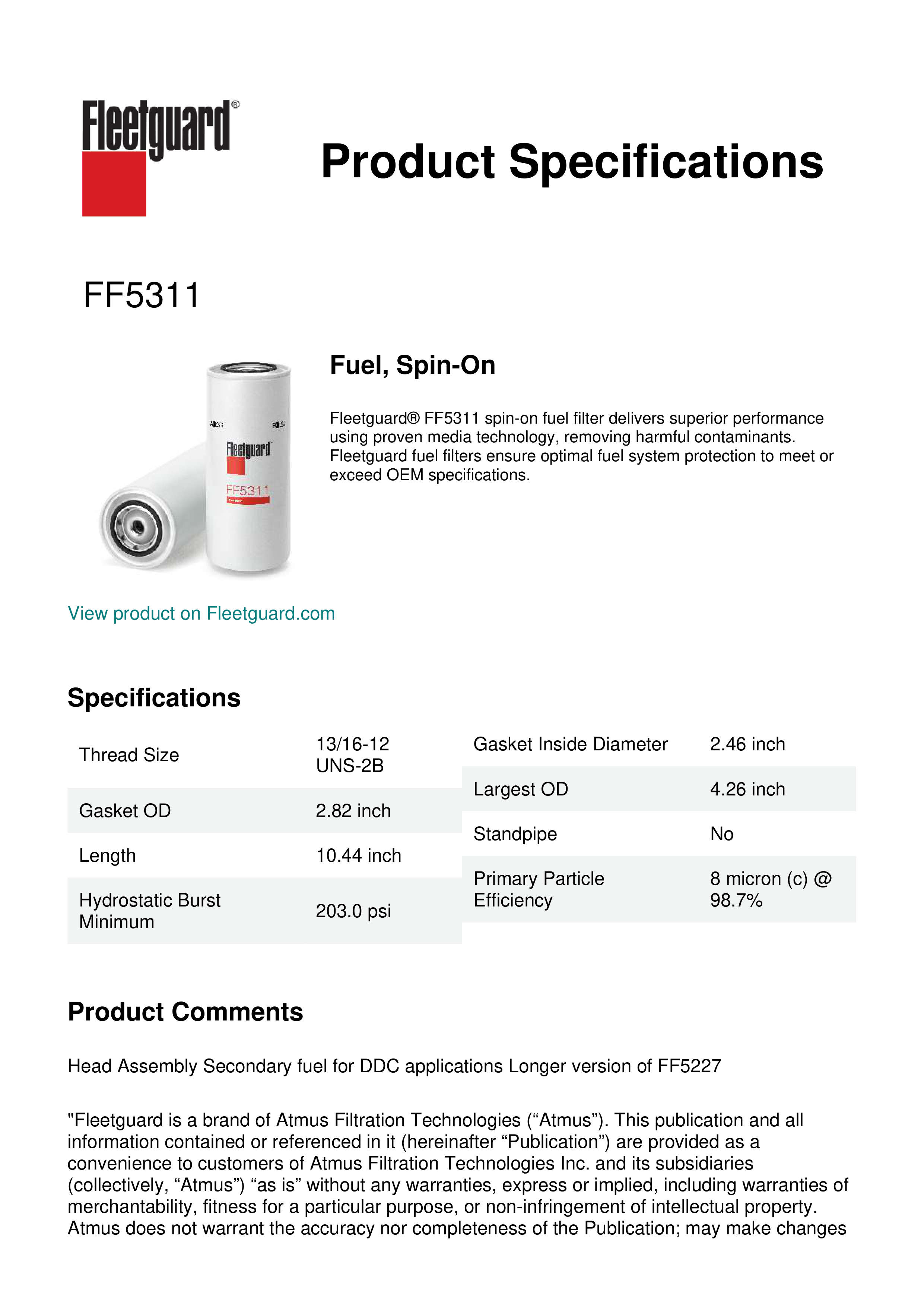Fleetguard® FF5311 spin-on fuel filter delivers superior performance using proven media technology, removing harmful contaminants. Fleetguard fuel filters ensure optimal fuel system protection to meet or exceed OEM specifications.Specification