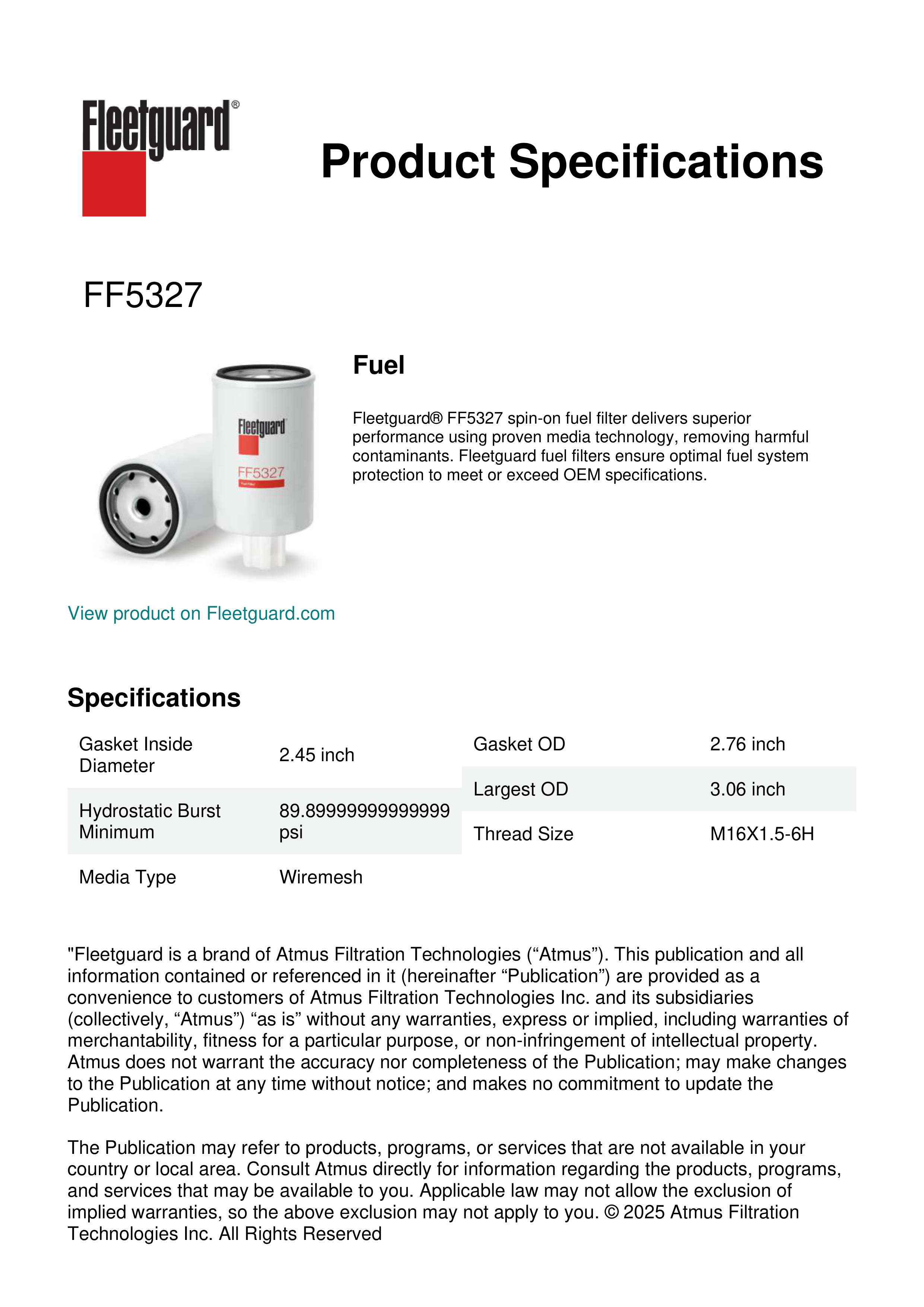 Fleetguard® FF5327 spin-on fuel filter delivers superior performance using proven media technology, removing harmful contaminants. Fleetguard fuel filters ensure optimal fuel system protection to meet or exceed OEM specifications.Specification