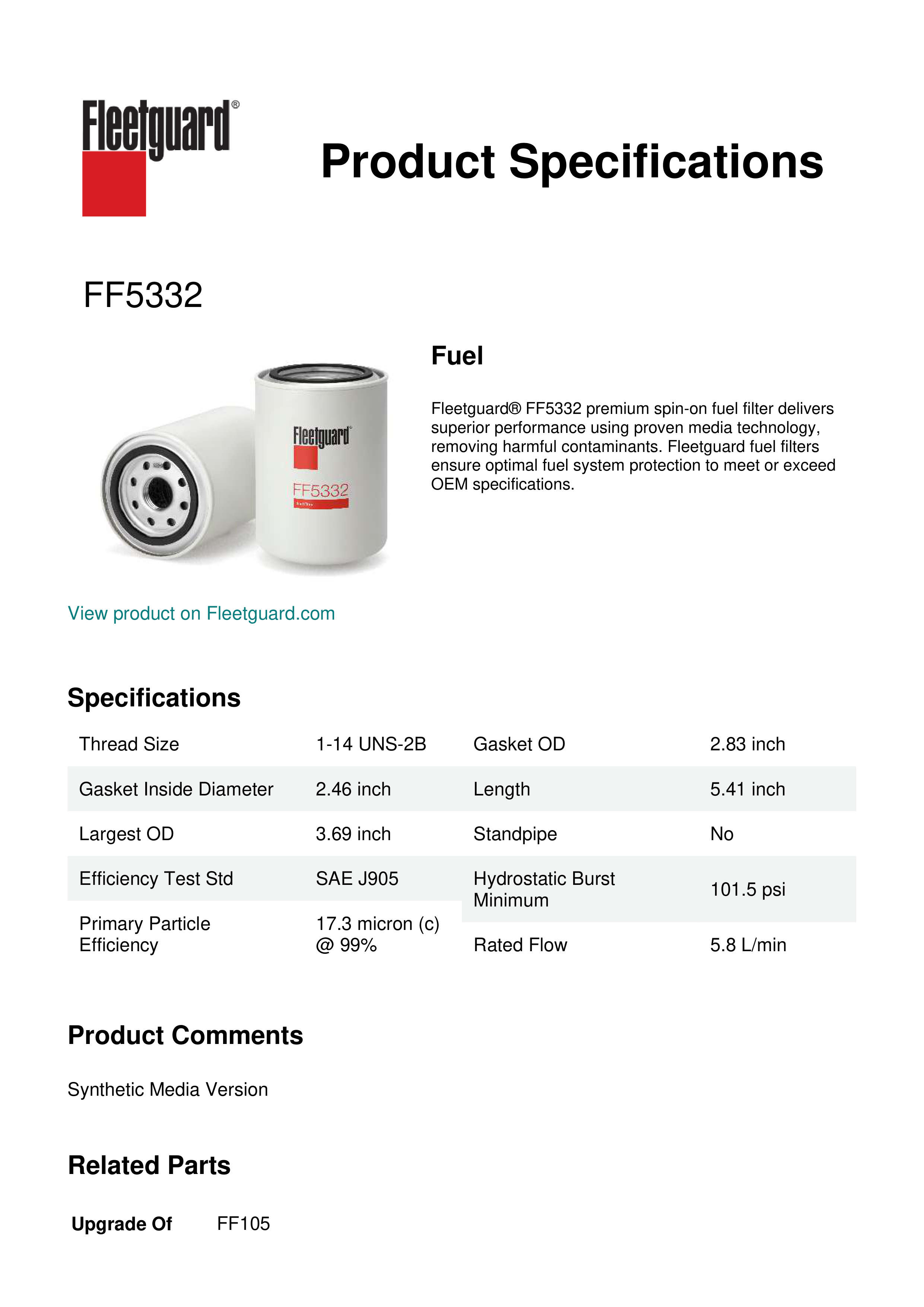 Fleetguard® FF5332 premium spin-on fuel filter delivers superior performance using proven media technology, removing harmful contaminants. Fleetguard fuel filters ensure optimal fuel system protection to meet or exceed OEM specifications.Specification