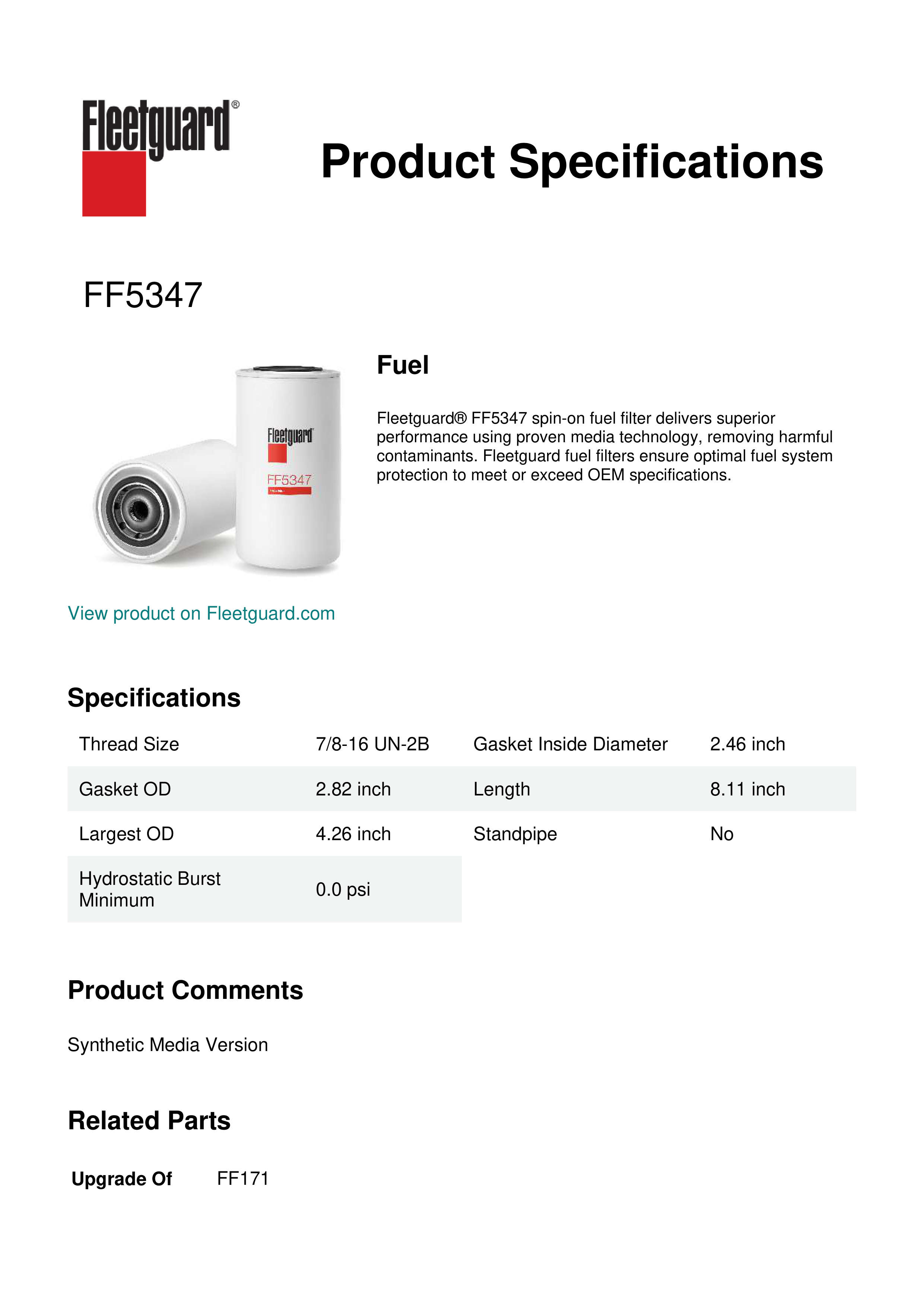 Fleetguard® FF5347 spin-on fuel filter delivers superior performance using proven media technology, removing harmful contaminants. Fleetguard fuel filters ensure optimal fuel system protection to meet or exceed OEM specifications.Specification