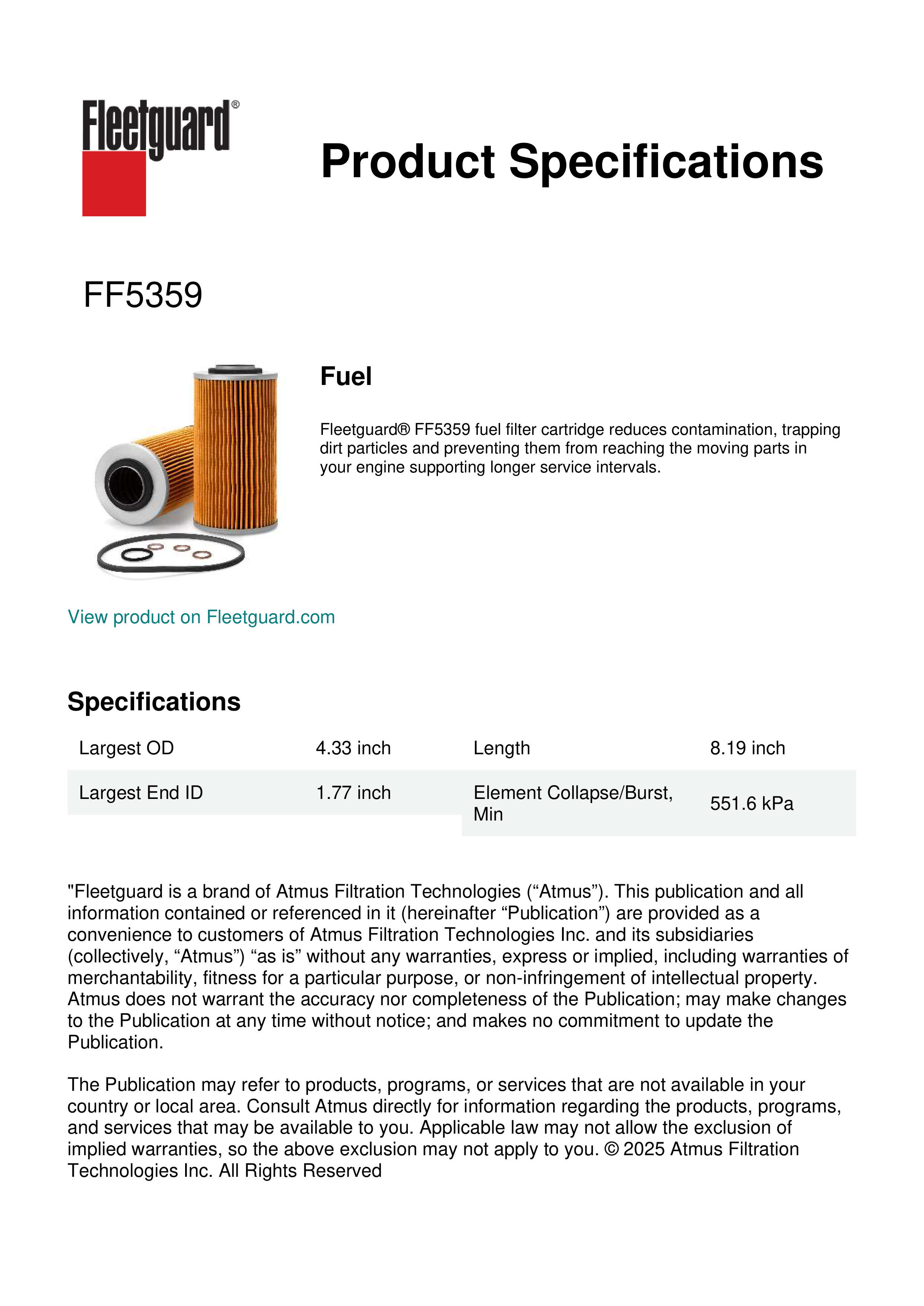 Fleetguard® FF5359 fuel filter cartridge reduces contamination, trapping dirt particles and preventing them from reaching the moving parts in your engine supporting longer service intervals.Specification