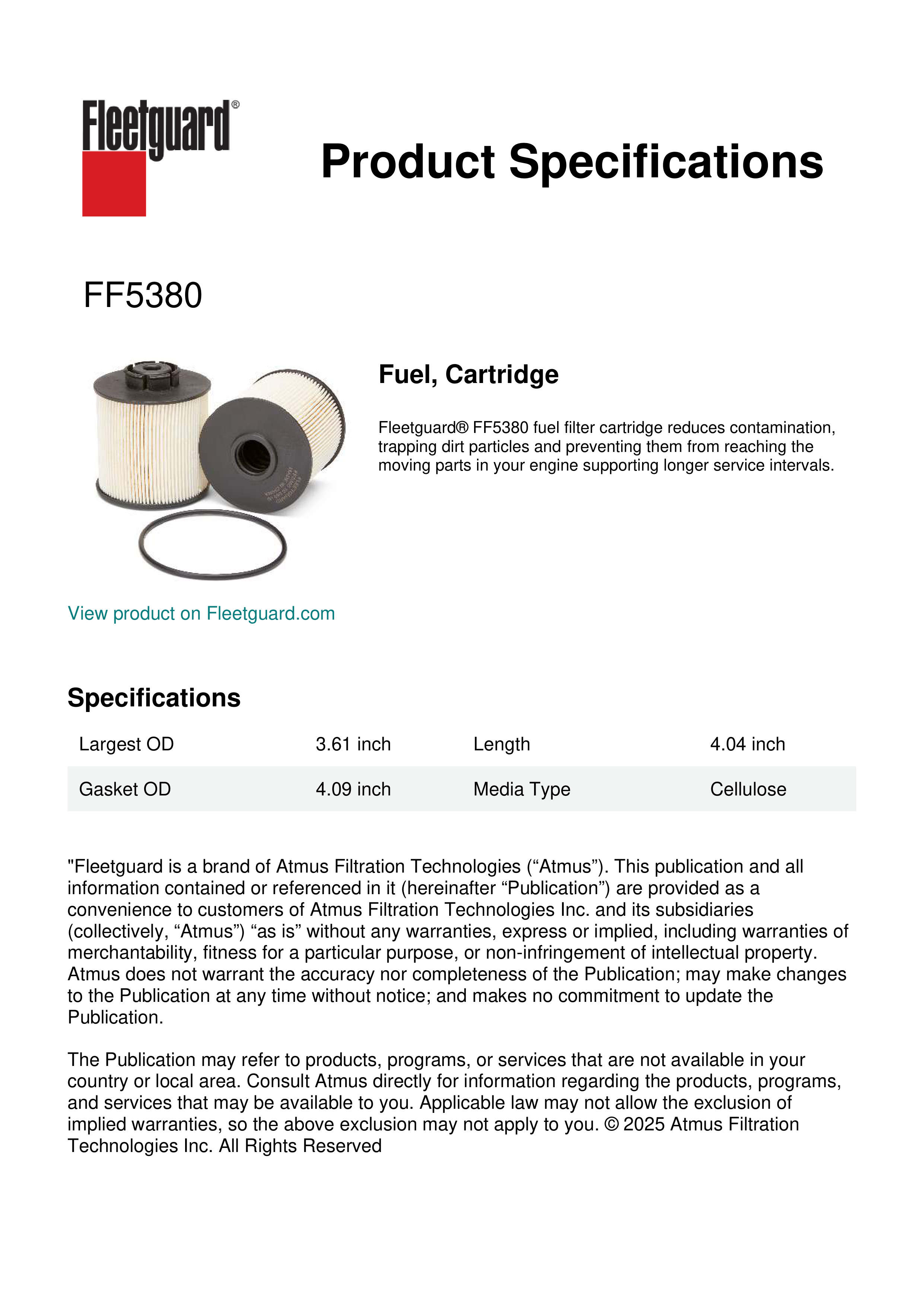 Fleetguard® FF5380 fuel filter cartridge reduces contamination, trapping dirt particles and preventing them from reaching the moving parts in your engine supporting longer service intervals.Specification