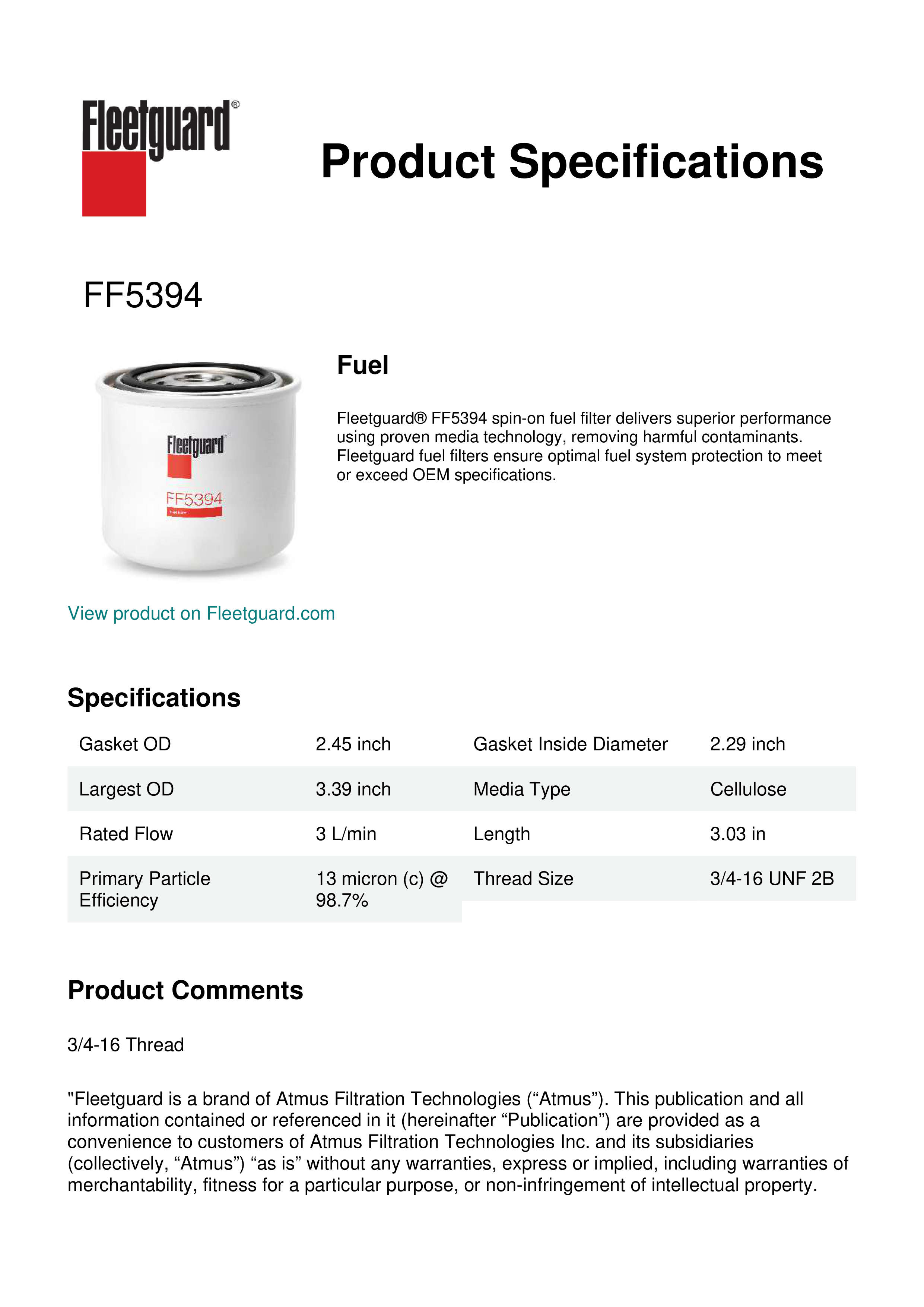 Fleetguard® FF5394 spin-on fuel filter delivers superior performance using proven media technology, removing harmful contaminants. Fleetguard fuel filters ensure optimal fuel system protection to meet or exceed OEM specifications.Specification