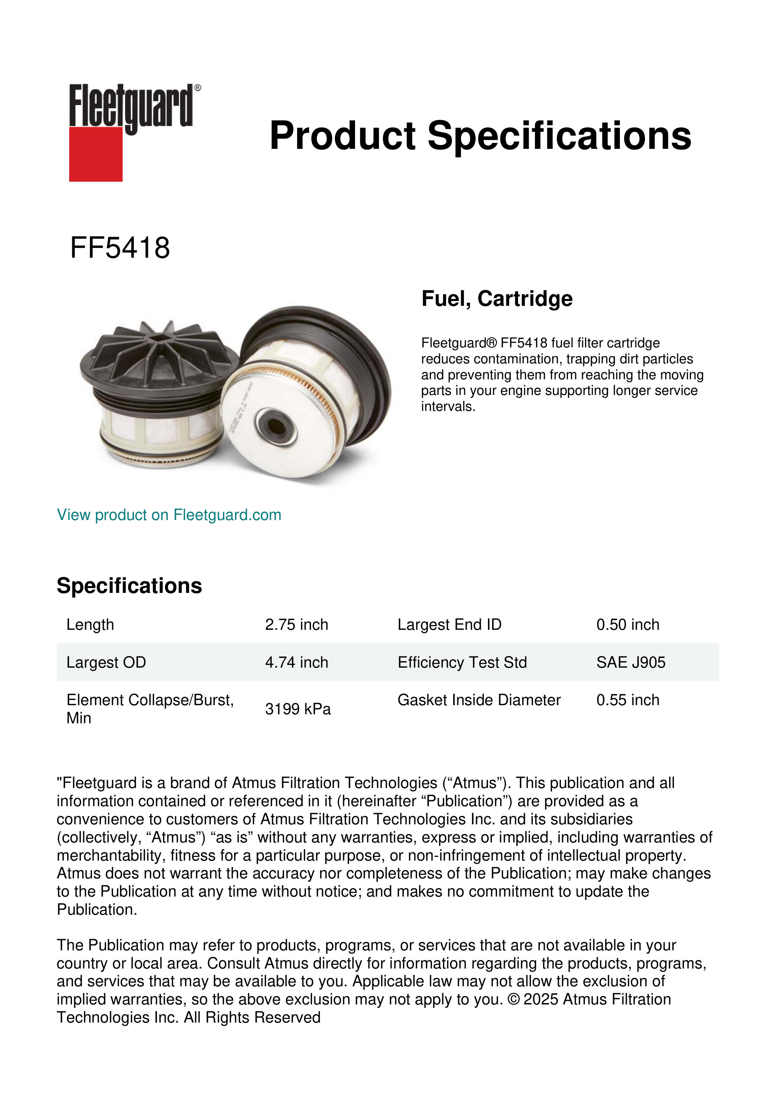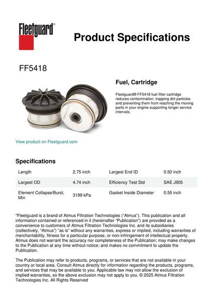 Fleetguard® FF5418 fuel filter cartridge reduces contamination, trapping dirt particles and preventing them from reaching the moving parts in your engine supporting longer service intervals.Specification