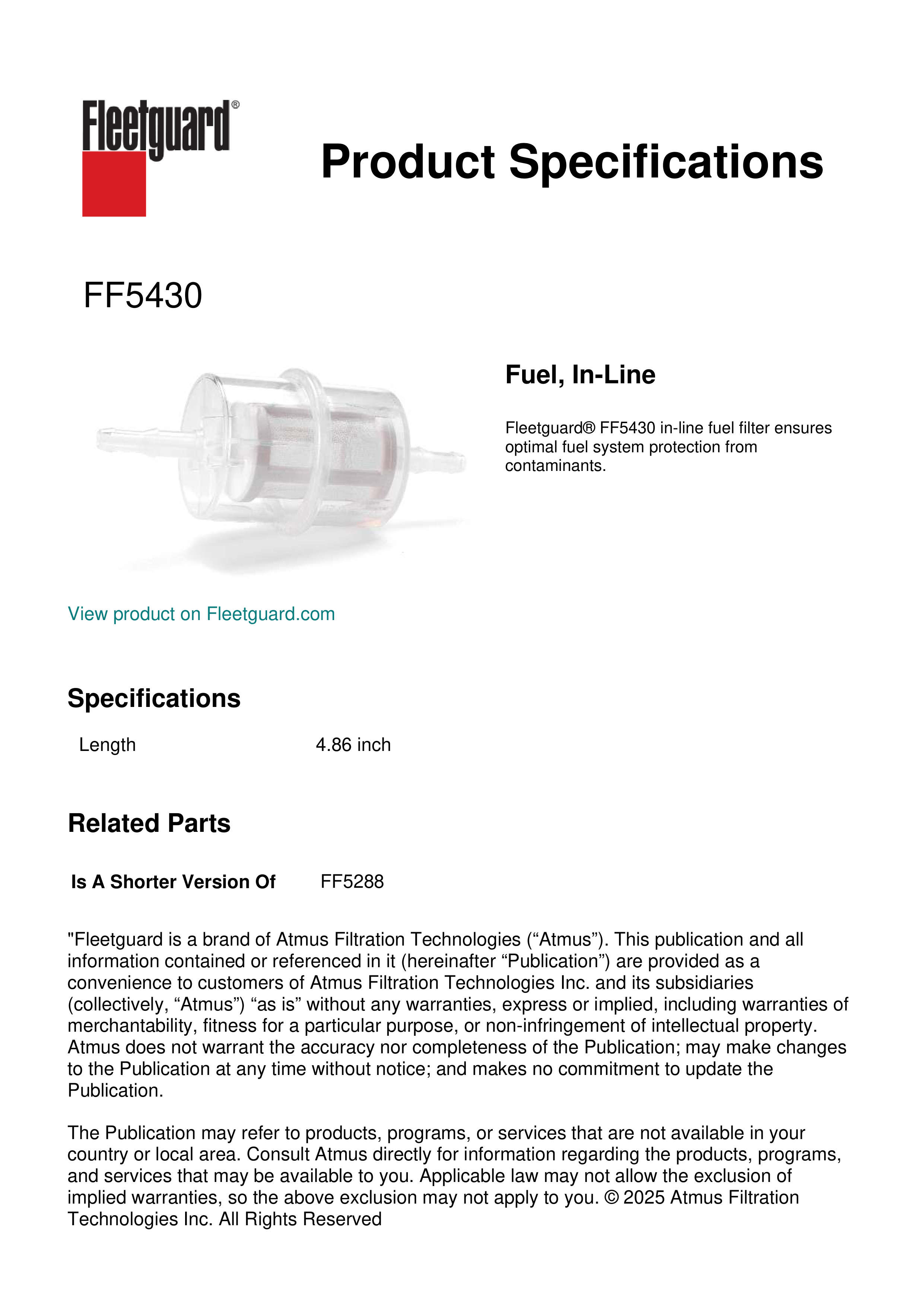 Fleetguard® FF5430 in-line fuel filter ensures optimal fuel system protection from contaminants.Specification