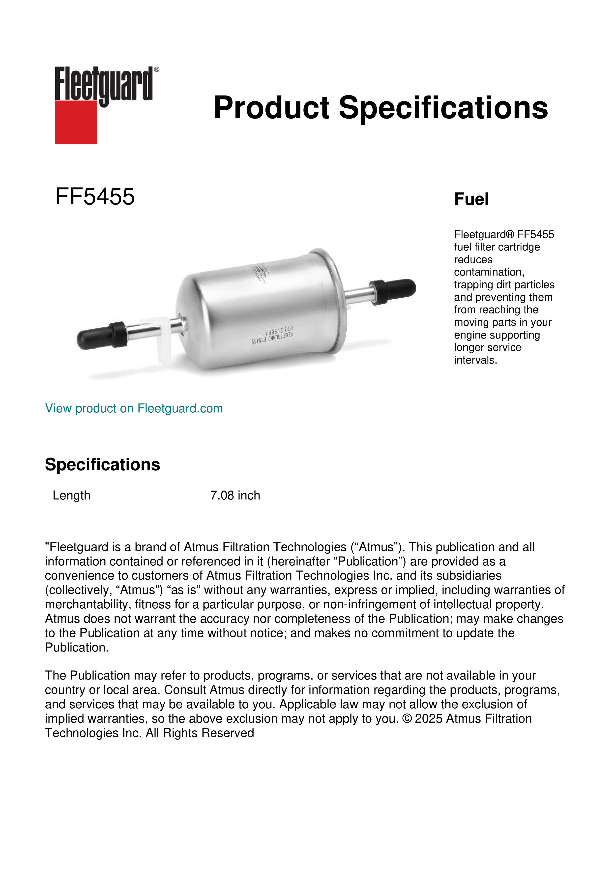 Fleetguard® FF5455 fuel filter cartridge reduces contamination, trapping dirt particles and preventing them from reaching the moving parts in your engine supporting longer service intervals.Specification