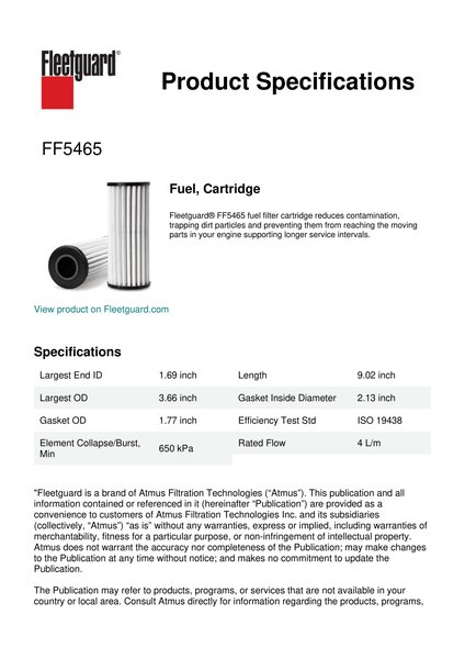 Fleetguard® FF5465 fuel filter cartridge reduces contamination, trapping dirt particles and preventing them from reaching the moving parts in your engine supporting longer service intervals.Specification