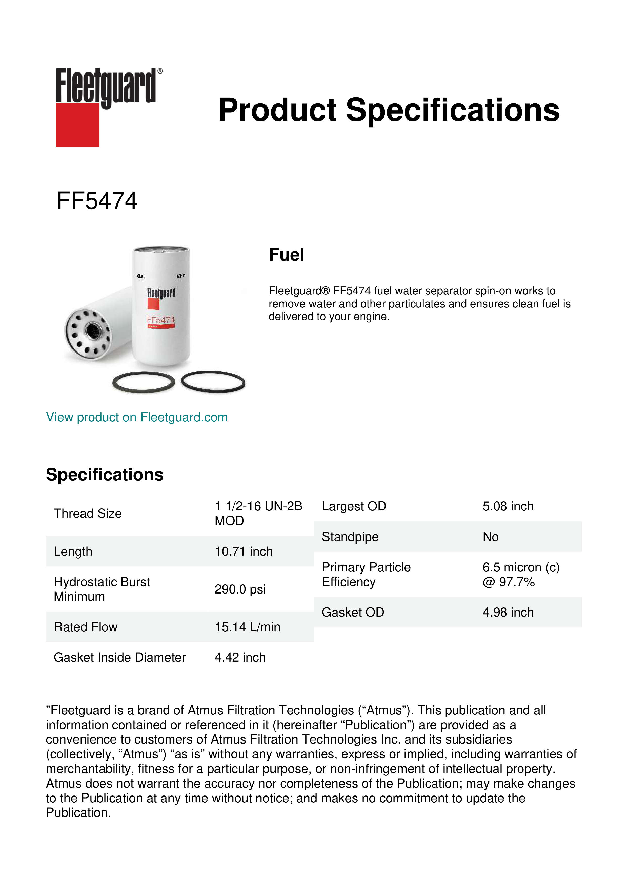 Fleetguard® FF5474 fuel water separator spin-on works to remove water and other particulates and ensures clean fuel is delivered to your engine.Specification