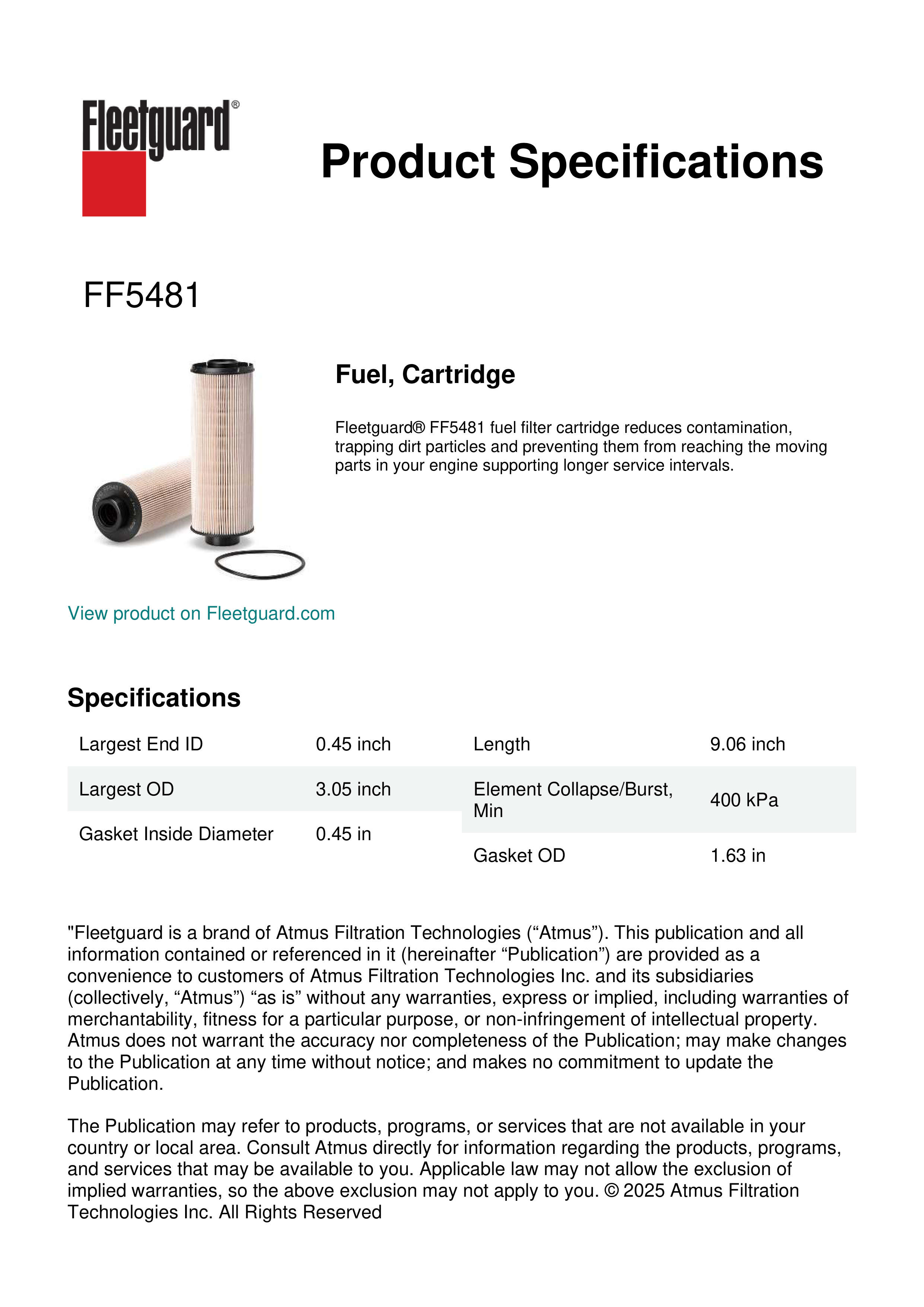 Fleetguard® FF5481 fuel filter cartridge reduces contamination, trapping dirt particles and preventing them from reaching the moving parts in your engine supporting longer service intervals.Specification