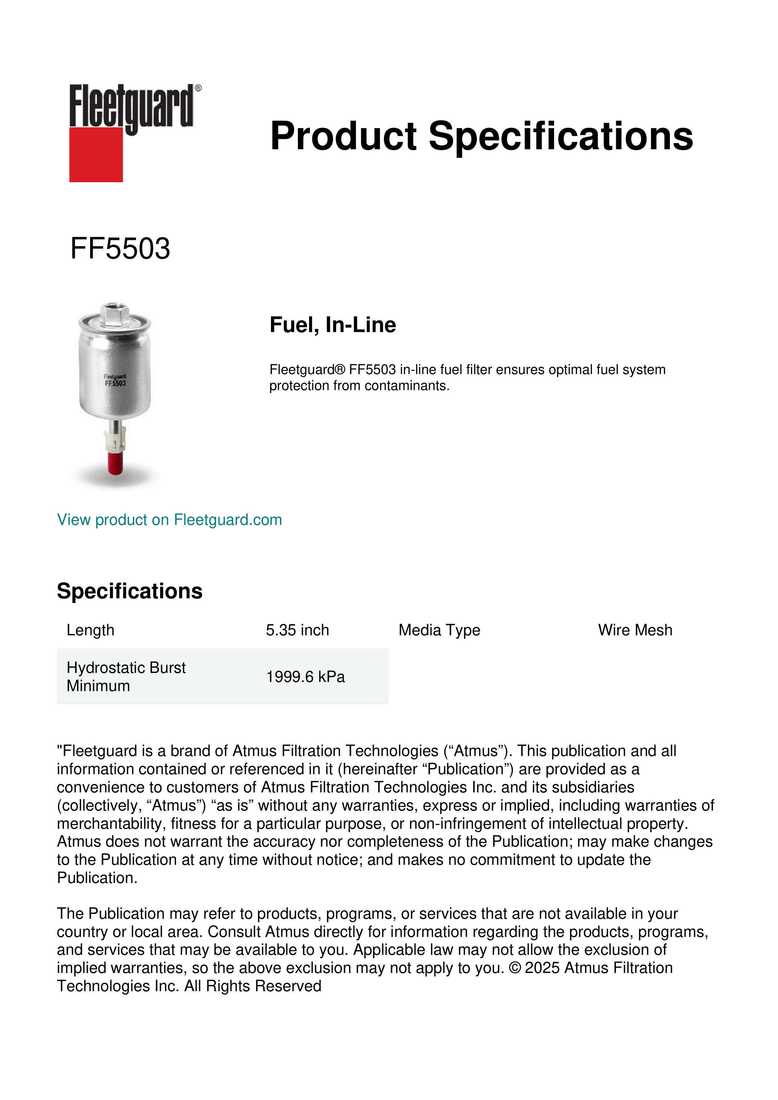 Fleetguard® FF5503 in-line fuel filter ensures optimal fuel system protection from contaminants.Specification
