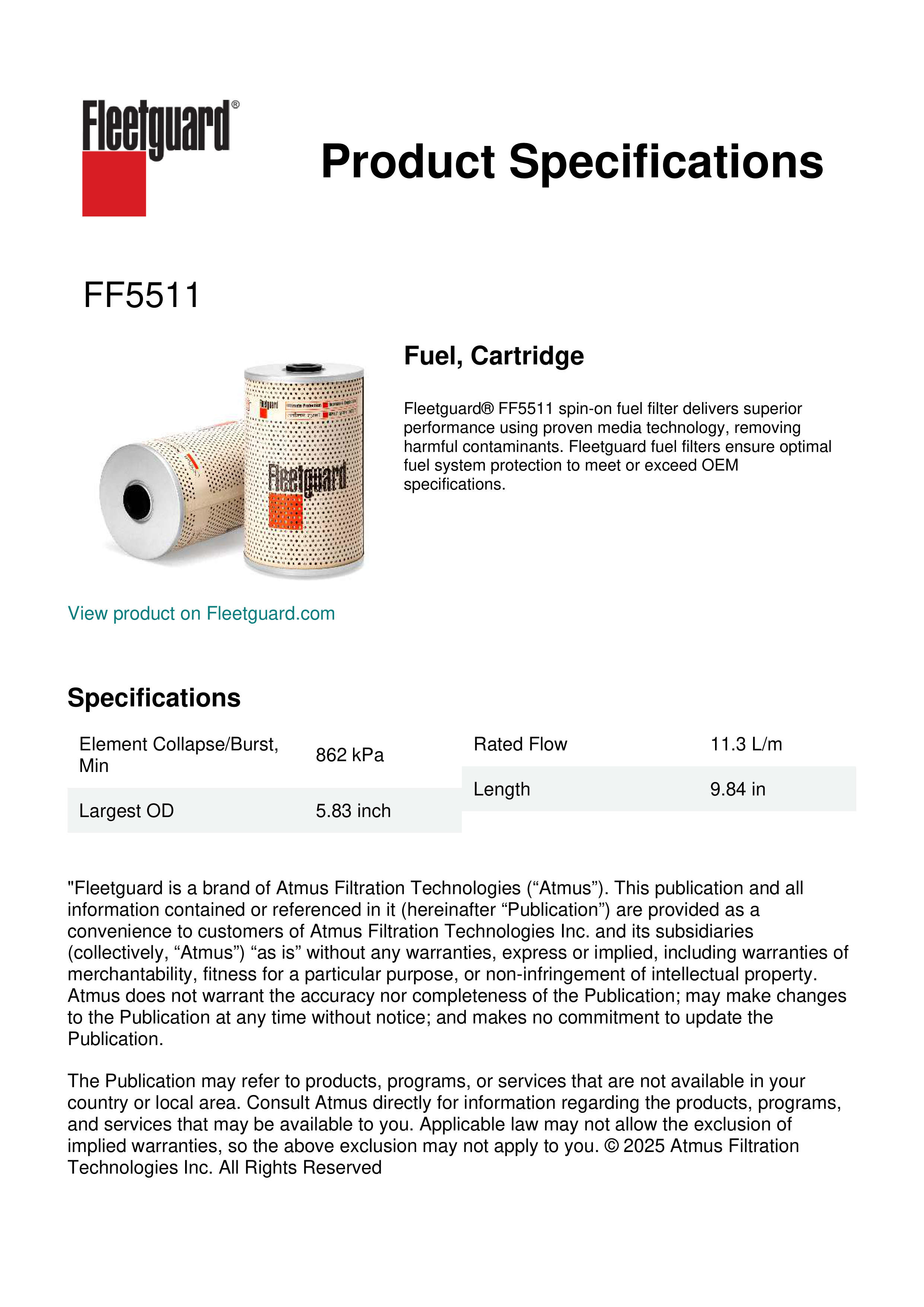 Fleetguard® FF5511 spin-on fuel filter delivers superior performance using proven media technology, removing harmful contaminants. Fleetguard fuel filters ensure optimal fuel system protection to meet or exceed OEM specifications.Specification