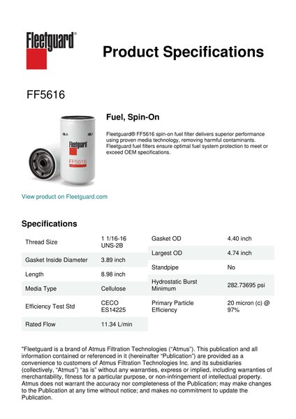 Fleetguard® FF5616 spin-on fuel filter delivers superior performance using proven media technology, removing harmful contaminants. Fleetguard fuel filters ensure optimal fuel system protection to meet or exceed OEM specifications.Specification