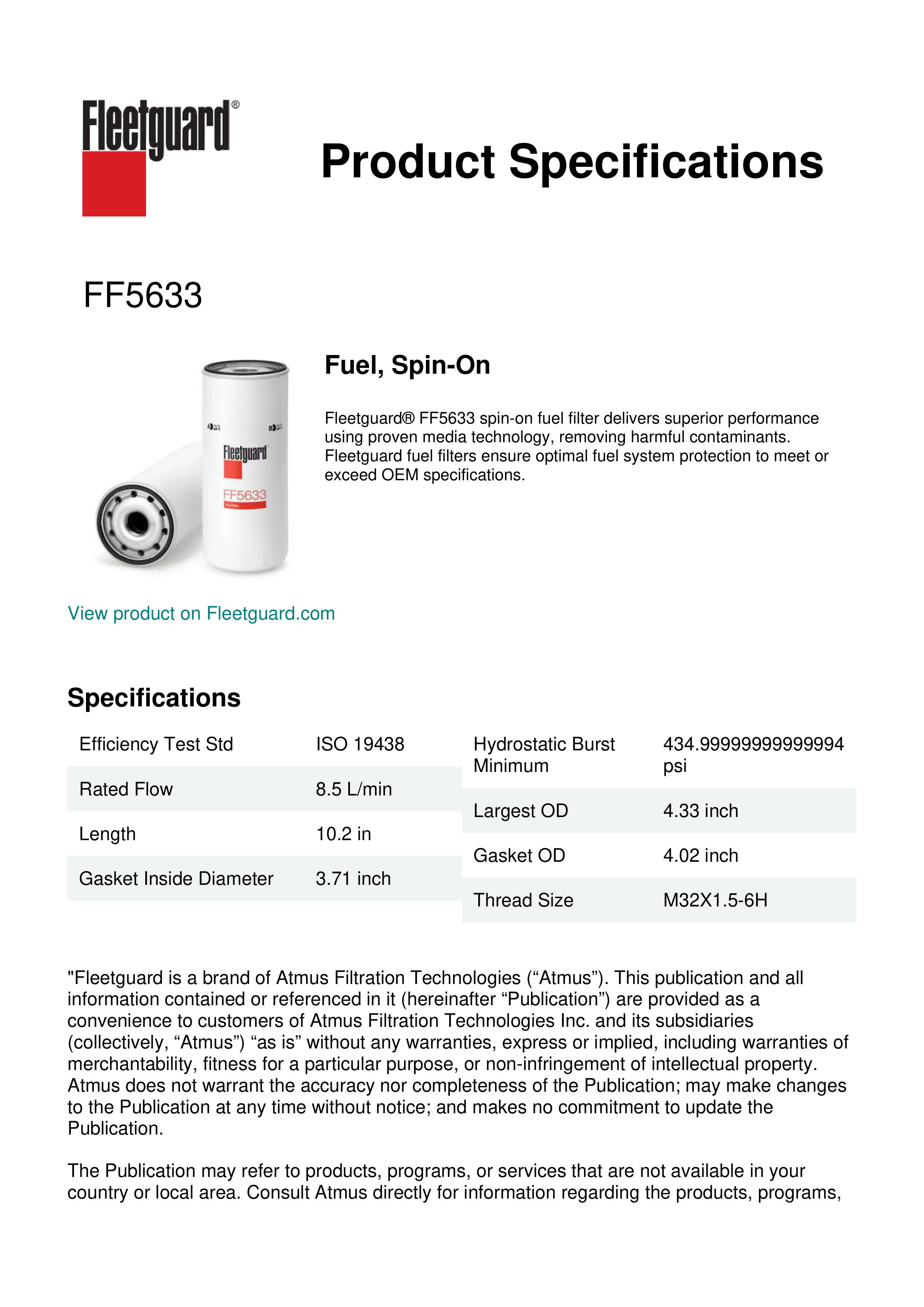 Fleetguard® FF5633 spin-on fuel filter delivers superior performance using proven media technology, removing harmful contaminants. Fleetguard fuel filters ensure optimal fuel system protection to meet or exceed OEM specifications.Specification