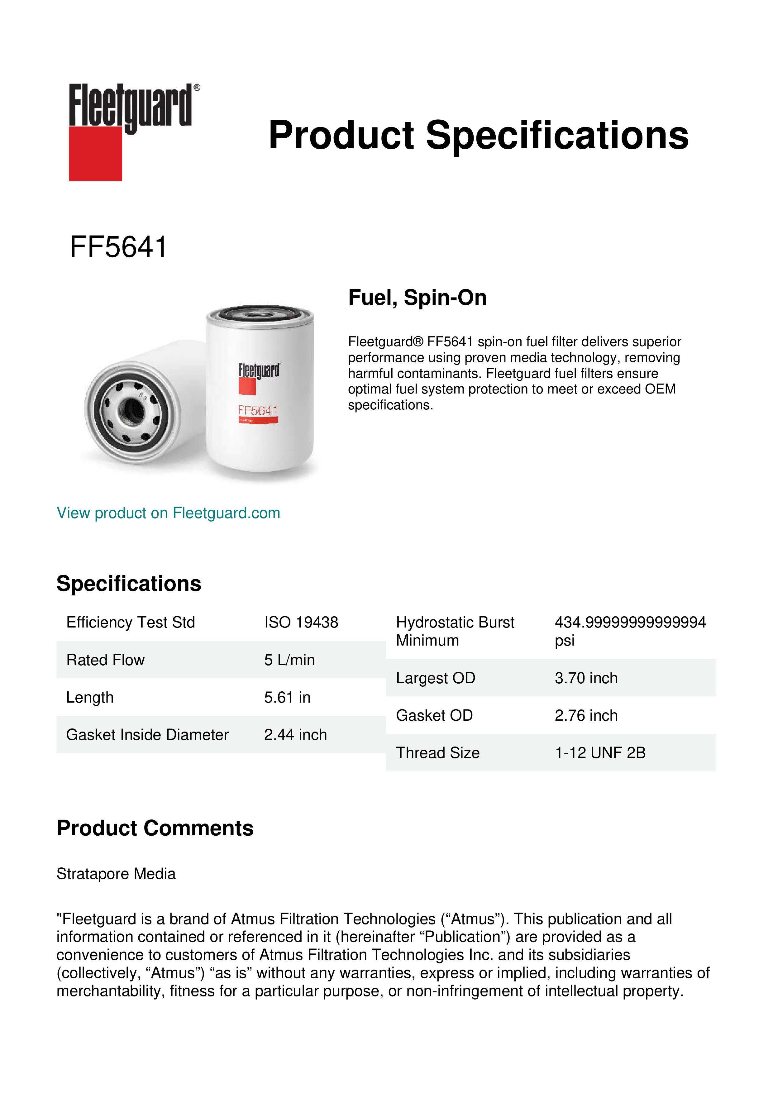 Fleetguard® FF5641 spin-on fuel filter delivers superior performance using proven media technology, removing harmful contaminants. Fleetguard fuel filters ensure optimal fuel system protection to meet or exceed OEM specifications.Specification