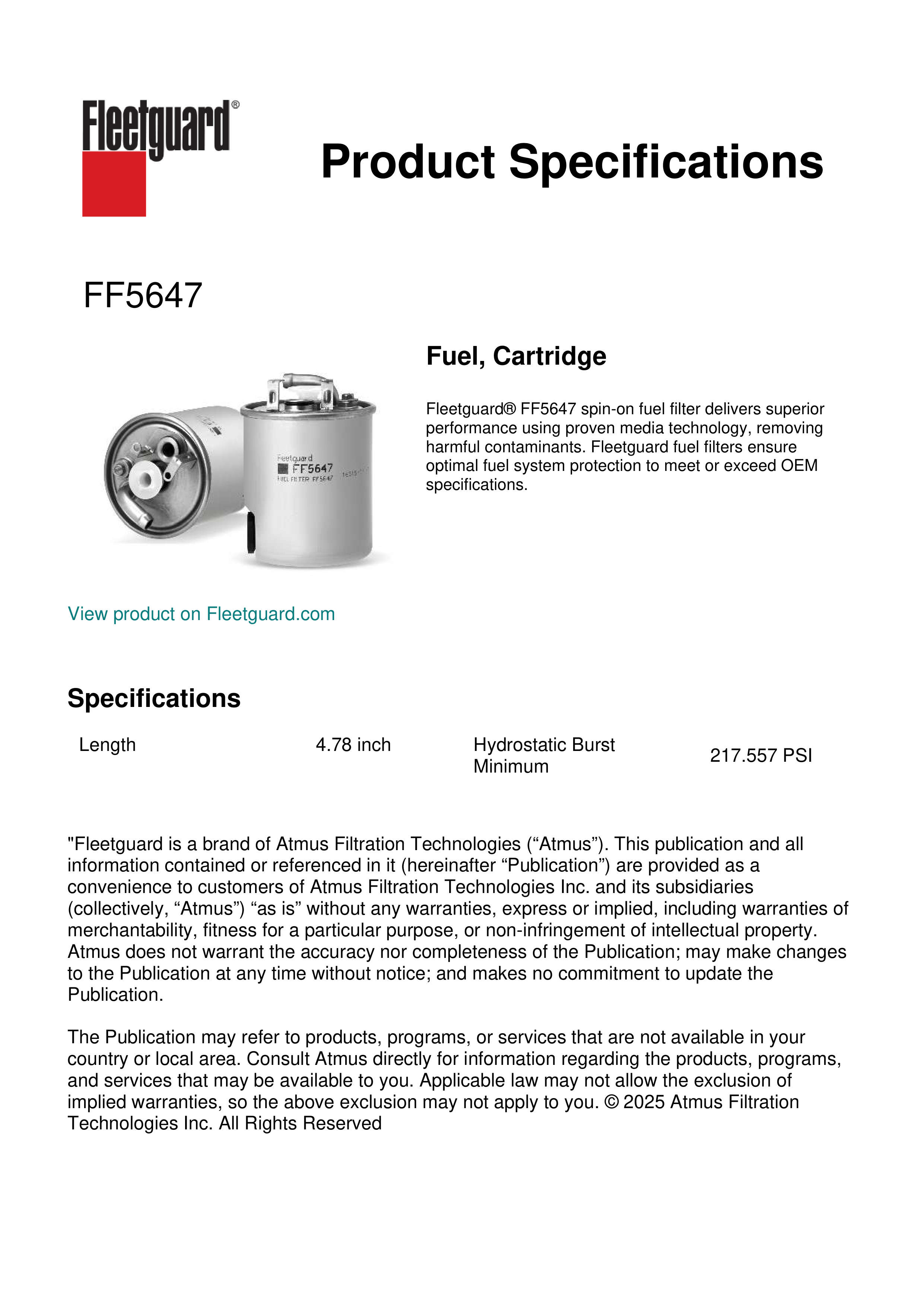 Fleetguard® FF5647 spin-on fuel filter delivers superior performance using proven media technology, removing harmful contaminants. Fleetguard fuel filters ensure optimal fuel system protection to meet or exceed OEM specifications.Specification