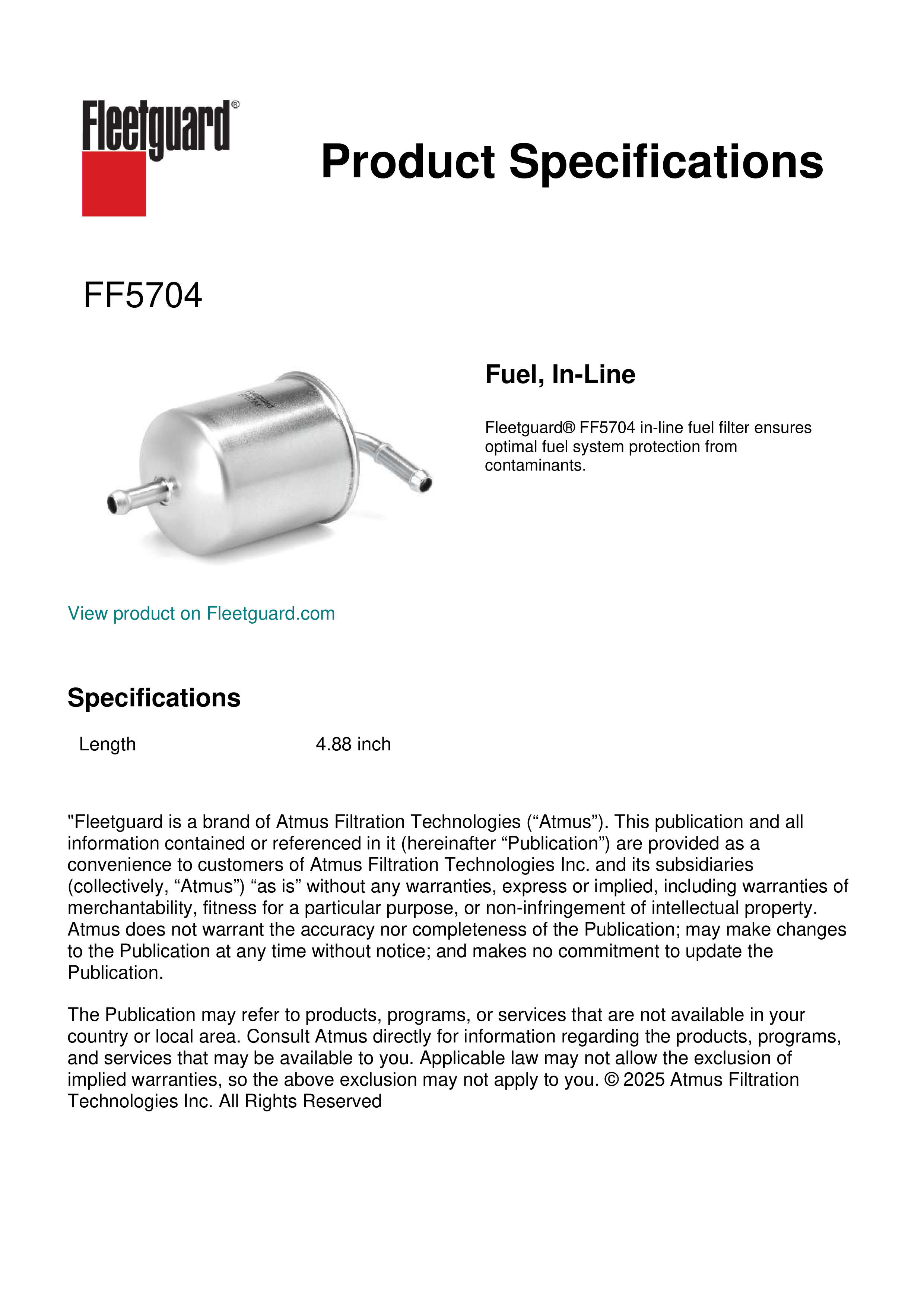 Fleetguard® FF5704 in-line fuel filter ensures optimal fuel system protection from contaminants.Specification