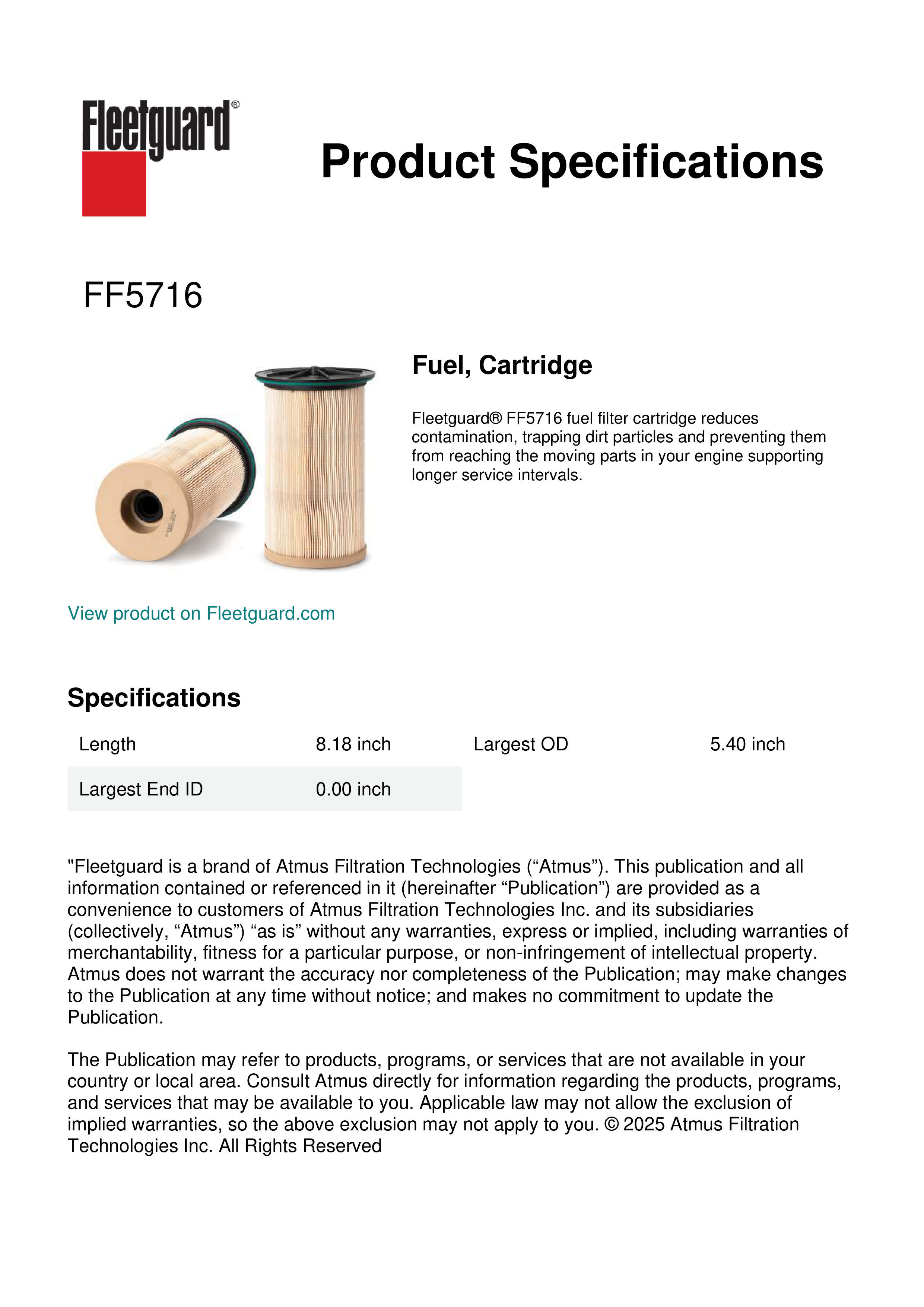 Fleetguard® FF5716 fuel filter cartridge reduces contamination, trapping dirt particles and preventing them from reaching the moving parts in your engine supporting longer service intervals.Specification