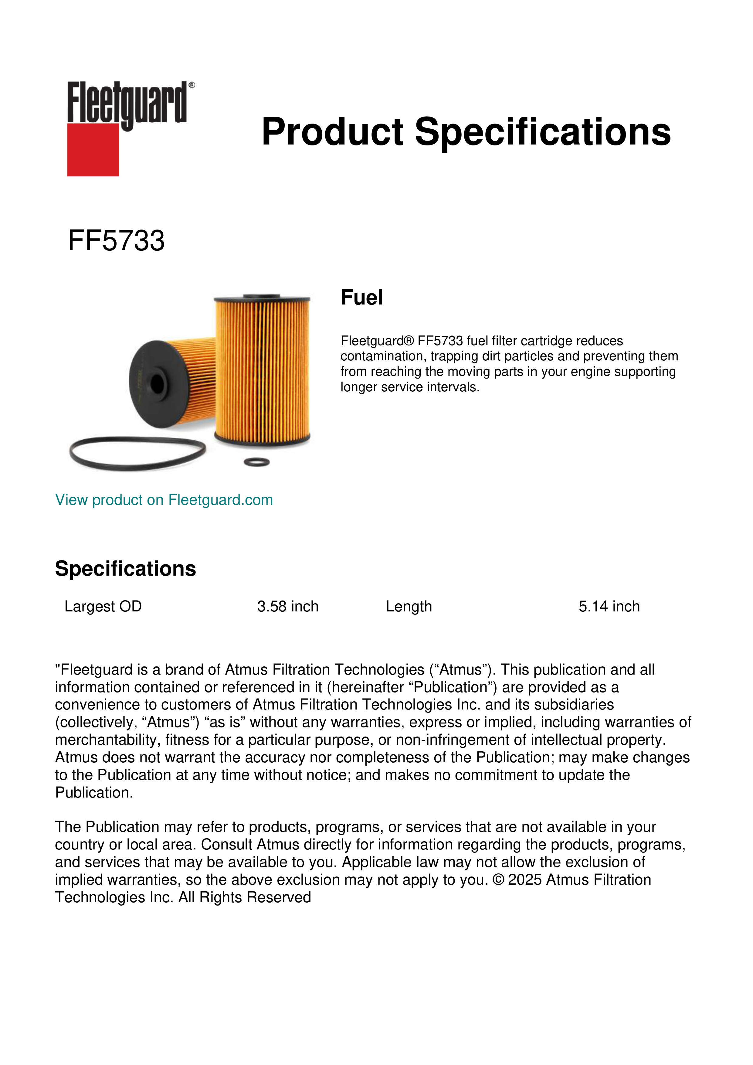 Fleetguard® FF5733 fuel filter cartridge reduces contamination, trapping dirt particles and preventing them from reaching the moving parts in your engine supporting longer service intervals.
