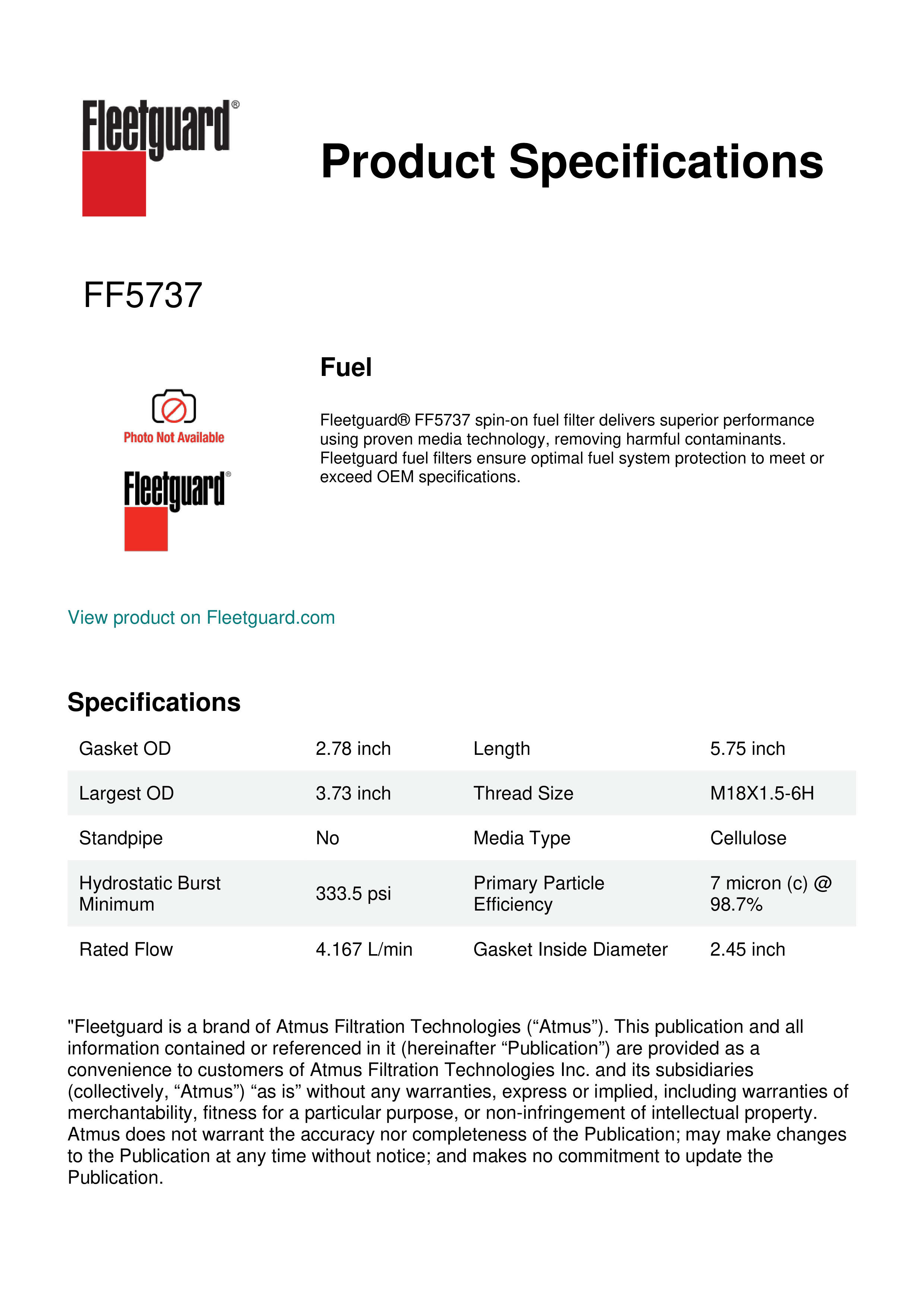 Fleetguard® FF5737 spin-on fuel filter delivers superior performance using proven media technology, removing harmful contaminants. Fleetguard fuel filters ensure optimal fuel system protection to meet or exceed OEM specifications.Specification