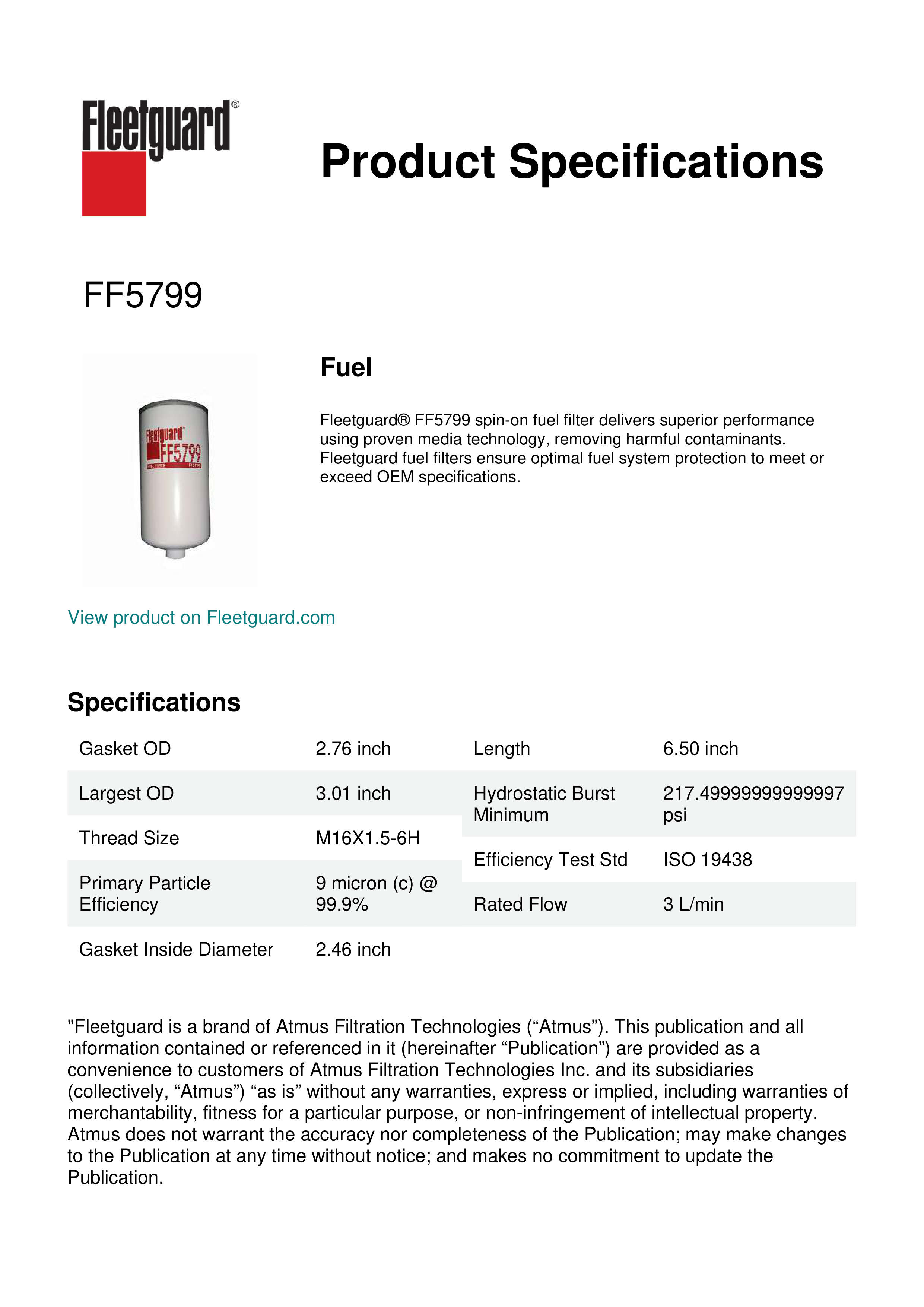 Fleetguard® FF5799 spin-on fuel filter delivers superior performance using proven media technology, removing harmful contaminants. Fleetguard fuel filters ensure optimal fuel system protection to meet or exceed OEM specifications.Specification