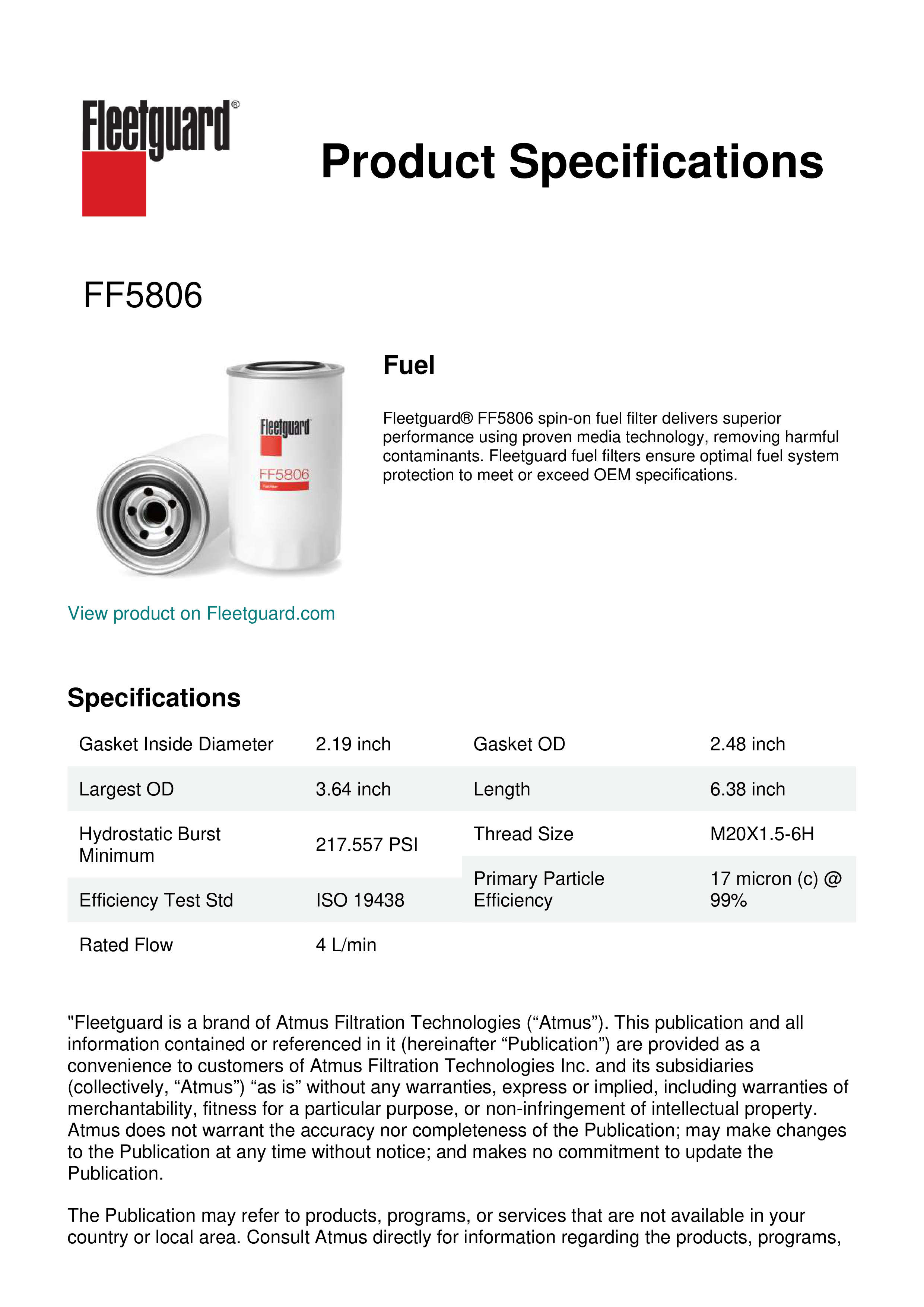 Fleetguard® FF5806 spin-on fuel filter delivers superior performance using proven media technology, removing harmful contaminants. Fleetguard fuel filters ensure optimal fuel system protection to meet or exceed OEM specifications.Specification