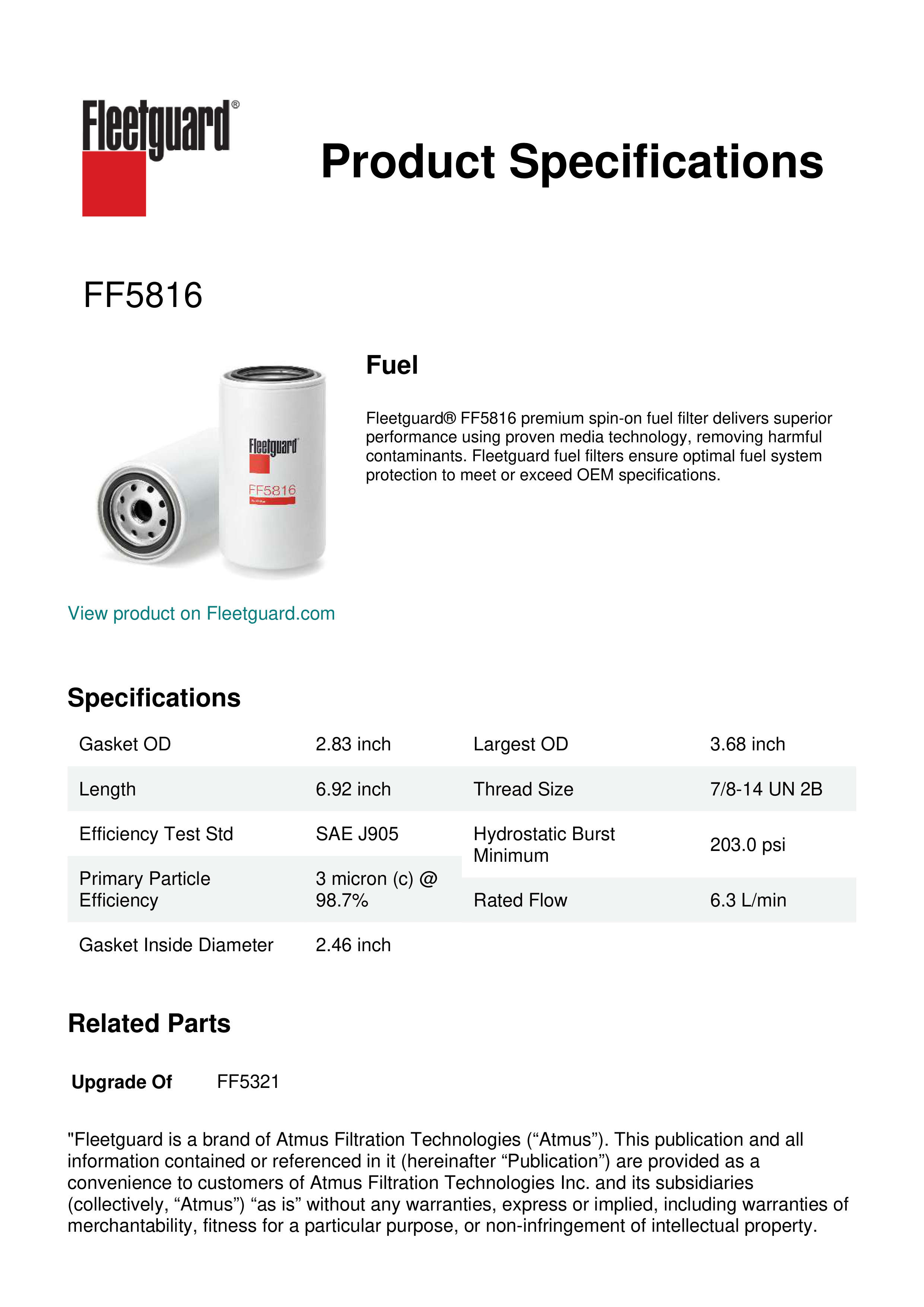 Fleetguard® FF5816 premium spin-on fuel filter delivers superior performance using proven media technology, removing harmful contaminants. Fleetguard fuel filters ensure optimal fuel system protection to meet or exceed OEM specifications.Specification