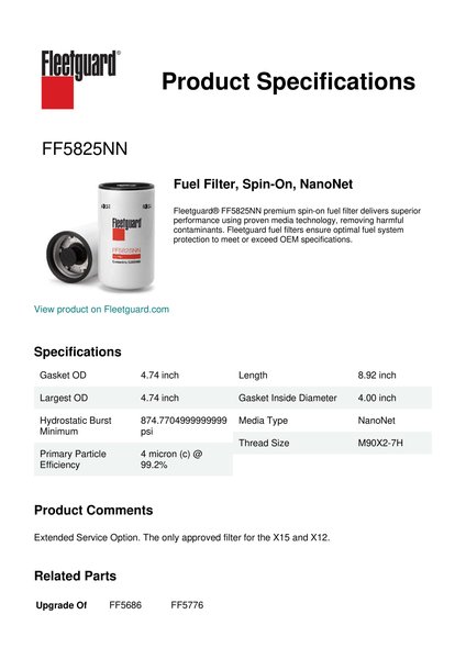 Fleetguard® FF5825NN premium spin-on fuel filter delivers superior performance using proven media technology, removing harmful contaminants. Fleetguard fuel filters ensure optimal fuel system protection to meet or exceed OEM specifications.Specification
